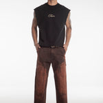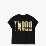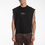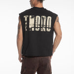 Playera 100% algodón en color negro con corte boxy sin mangas con diseño de Thoro en el frente y en la espalda con un imagen de un oasis fundida en las letras y logo de Oasis abajo. Impresión en serigrafía.