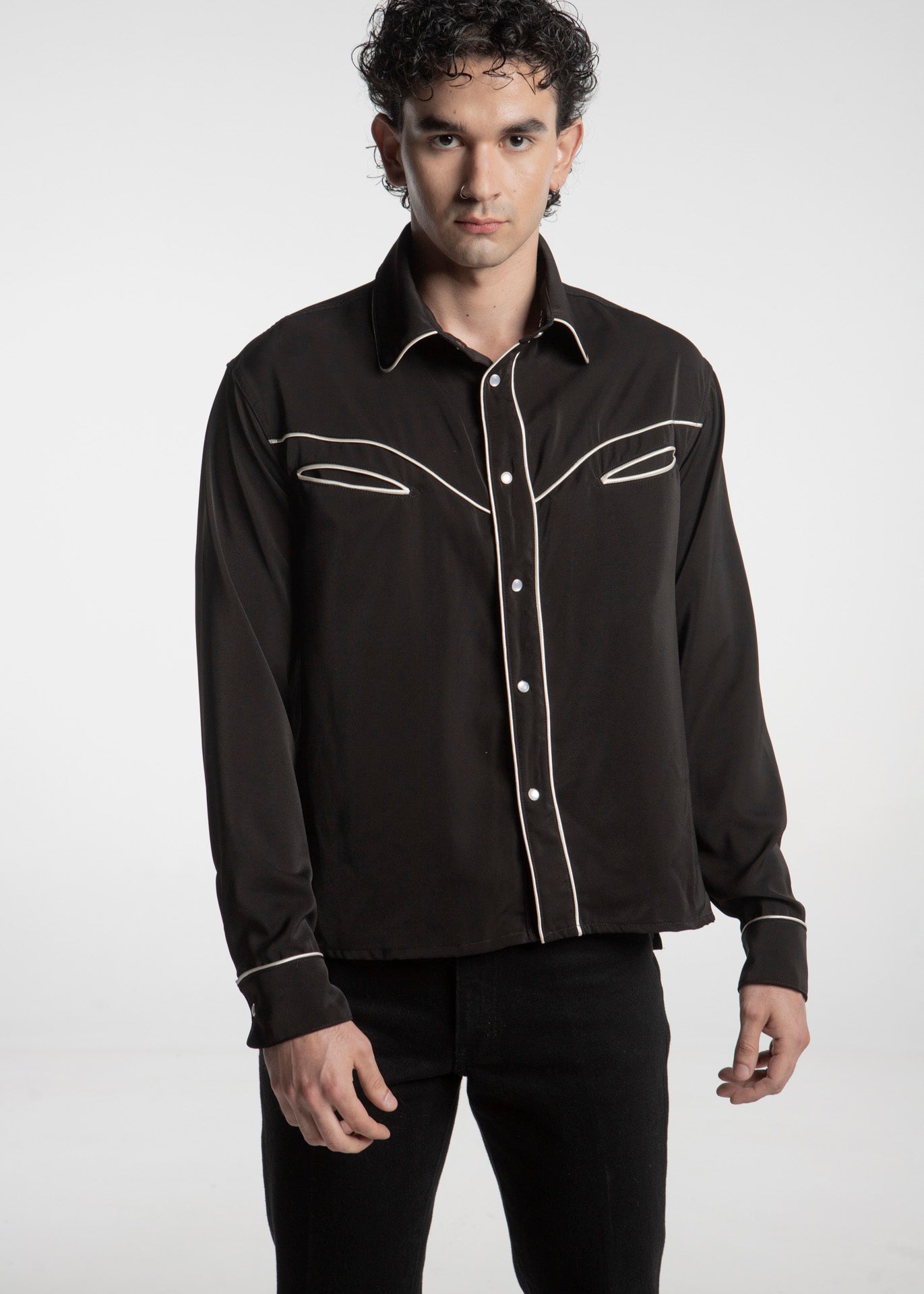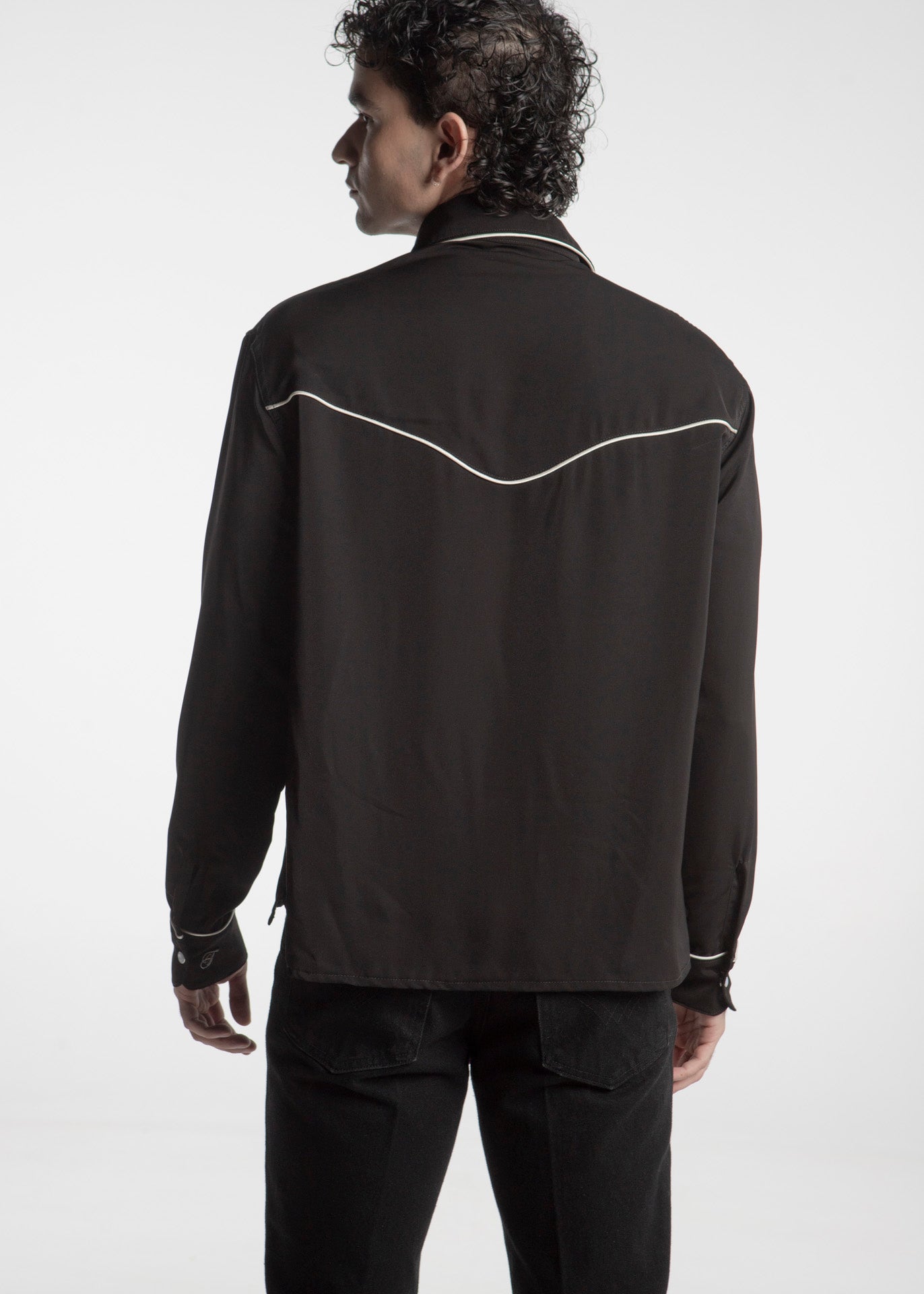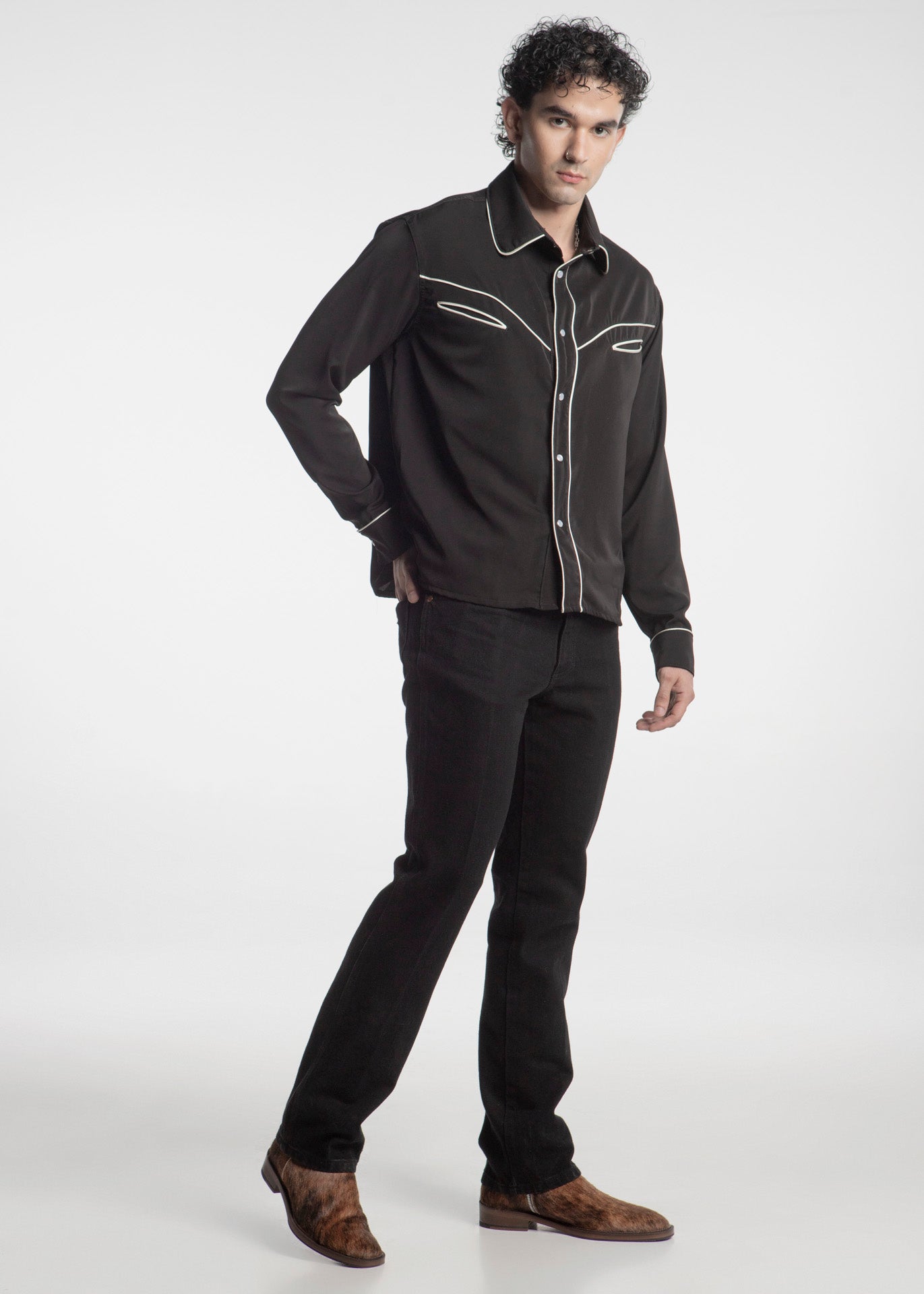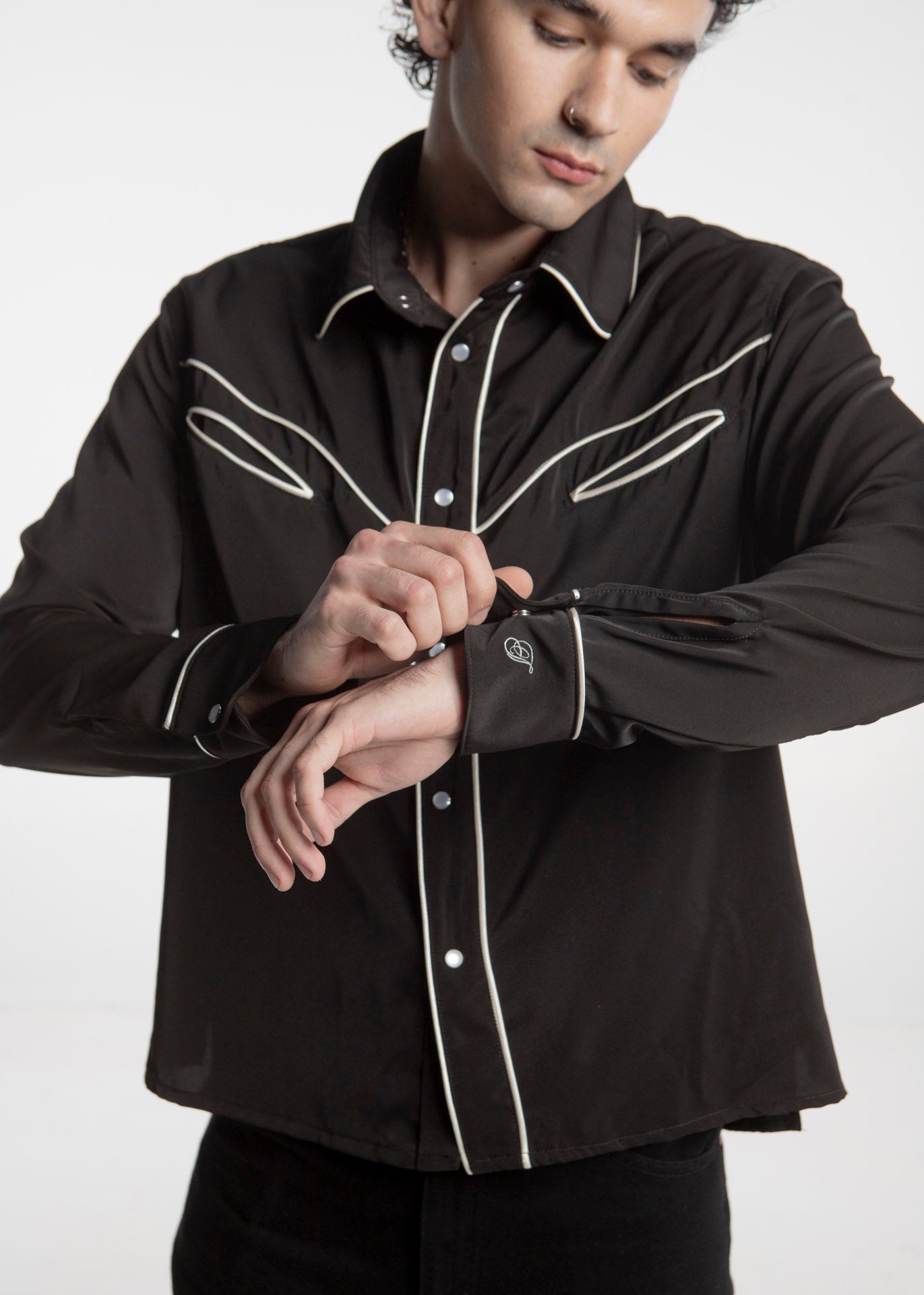Camiseta fabricada en tela tipo seda color Negro con ribetes vaqueros en color blanco, botones a presión estilo perla.