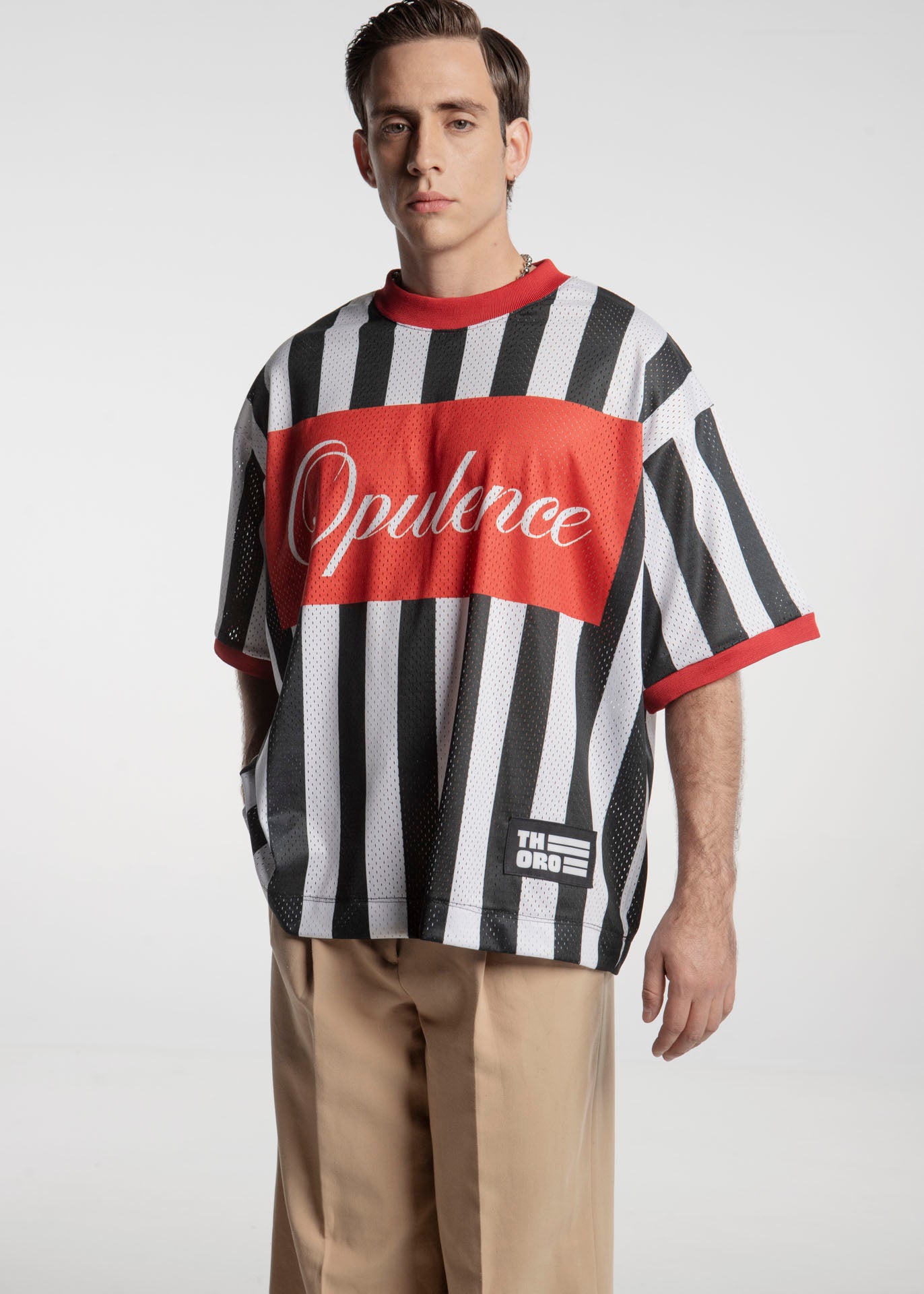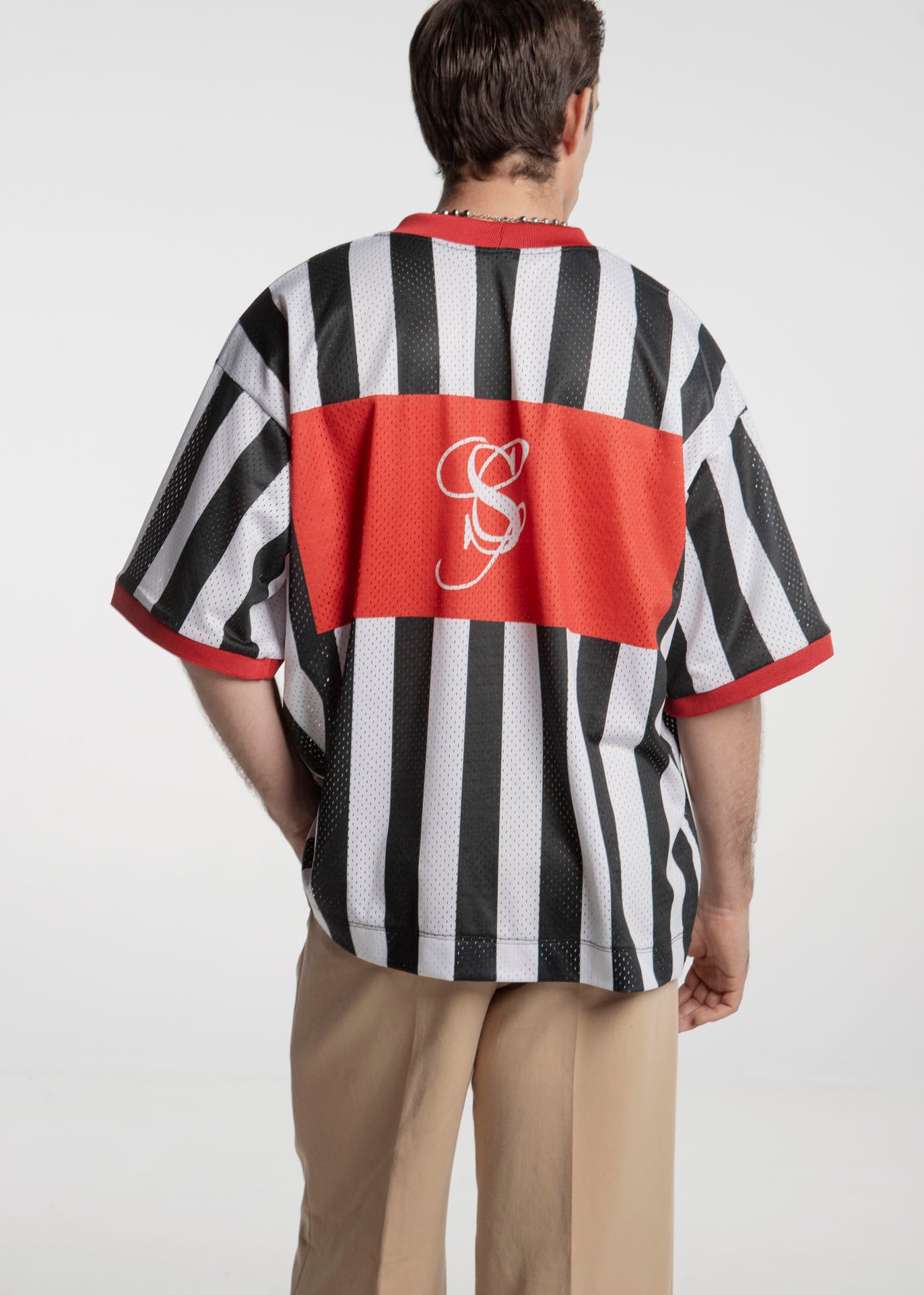 Jersey de rayas blanco y negro deportivo con una franja roja confeccionado en tela de micropunto transpirable y de secado rápido.