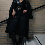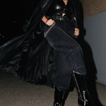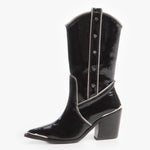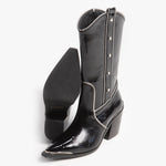 Bota vaquera (de tubo alto) fabricada en piel de res color negro acabado brillante con cierre lateral plateado, tacón cubano y punta metálica. Adornada con ribetes plateados y estrellas en el tubo.