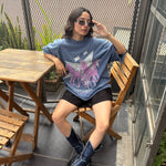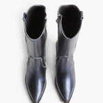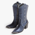 Bota vaquera (de tubo alto) fabricada en piel de res color azul acabado metálico con cierre lateral plateado, tacón cubano y punta metálica. Adornada con ribetes celestes y estrellas en el tubo.