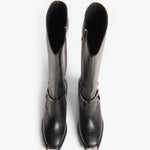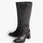 La bota Go Go Boot Negro es una pieza que combina altura y estilo western moderno. Está confeccionada en piel negra lisa de caña alta, con un look monocromático que enfatiza su silueta. Destaca por la puntera cuadrada rematada con metal y la correa de arnés en el tobillo con herrajes plateados. Montada sobre un tacón grueso, esta bota es ideal para quienes buscan un calzado con gran presencia y un estilo que domina el outfit.