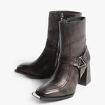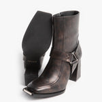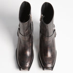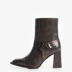 Botín de punta cuadrada tacón alto y arnés triangular lateral fabricada en piel de res color bronce