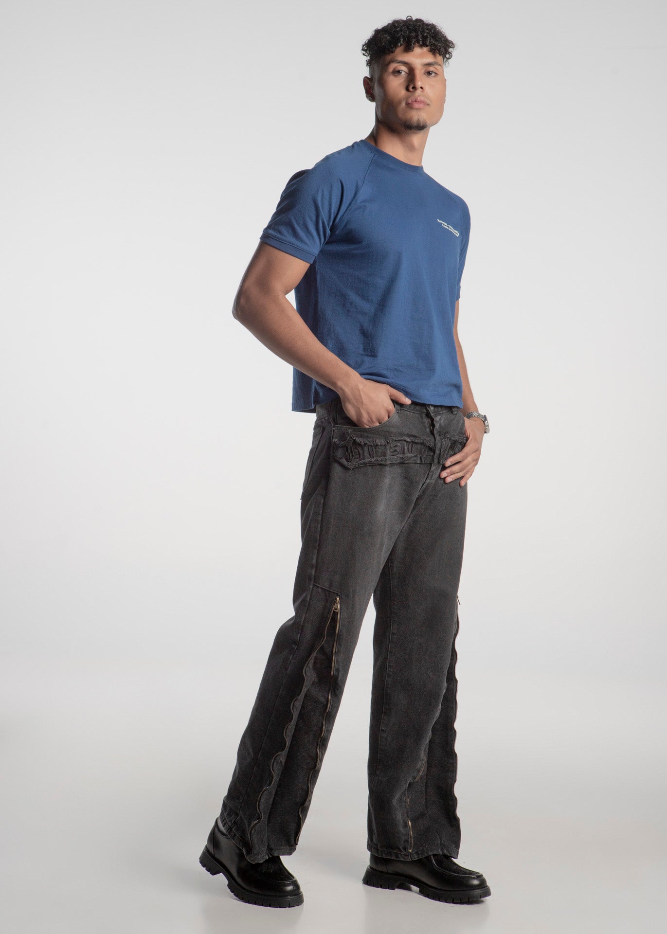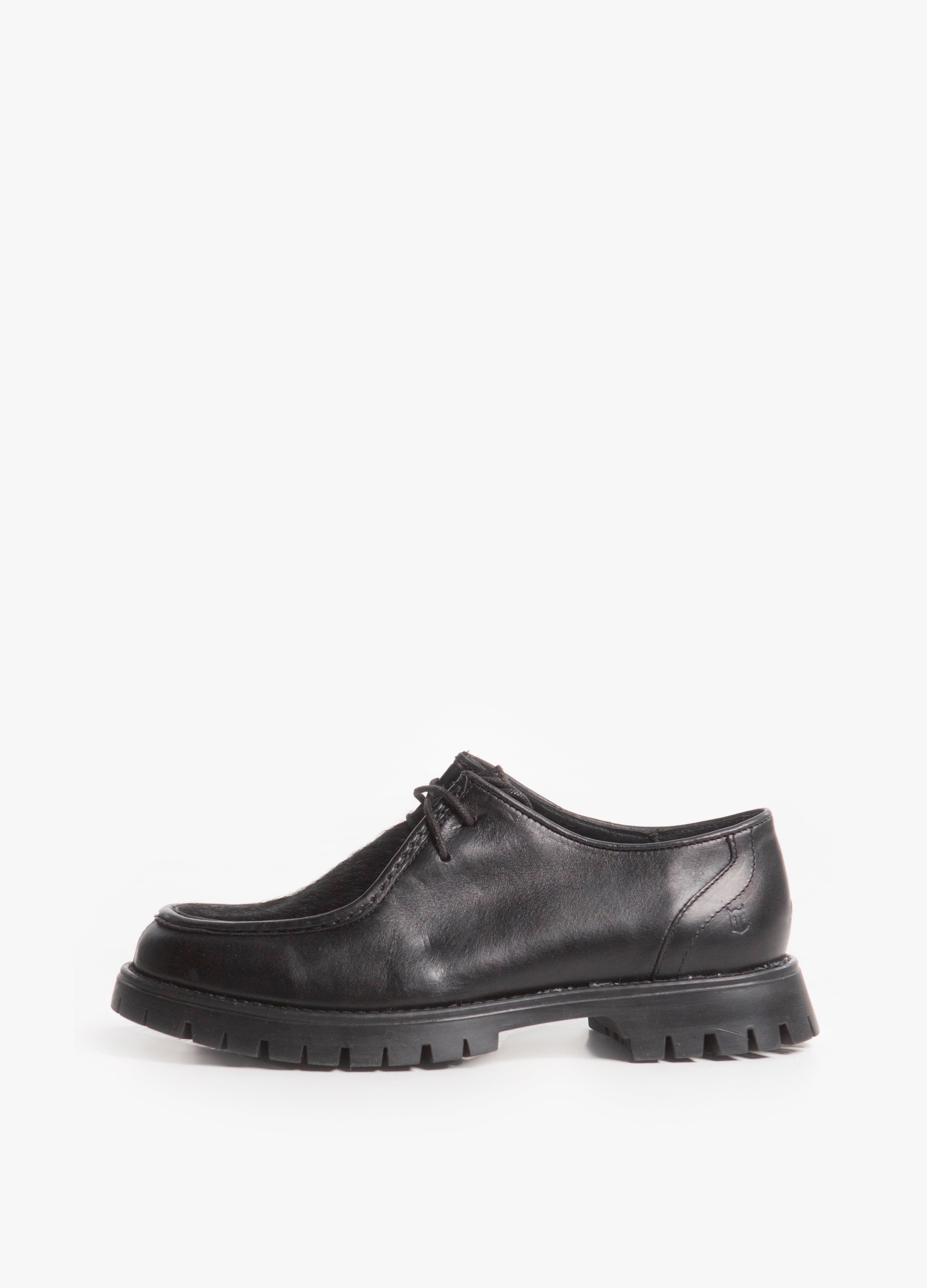 Zapato estilo wallabee, fabricado en piel de res color negro, con suela gruesa de goma y empeine con pelaje natural.