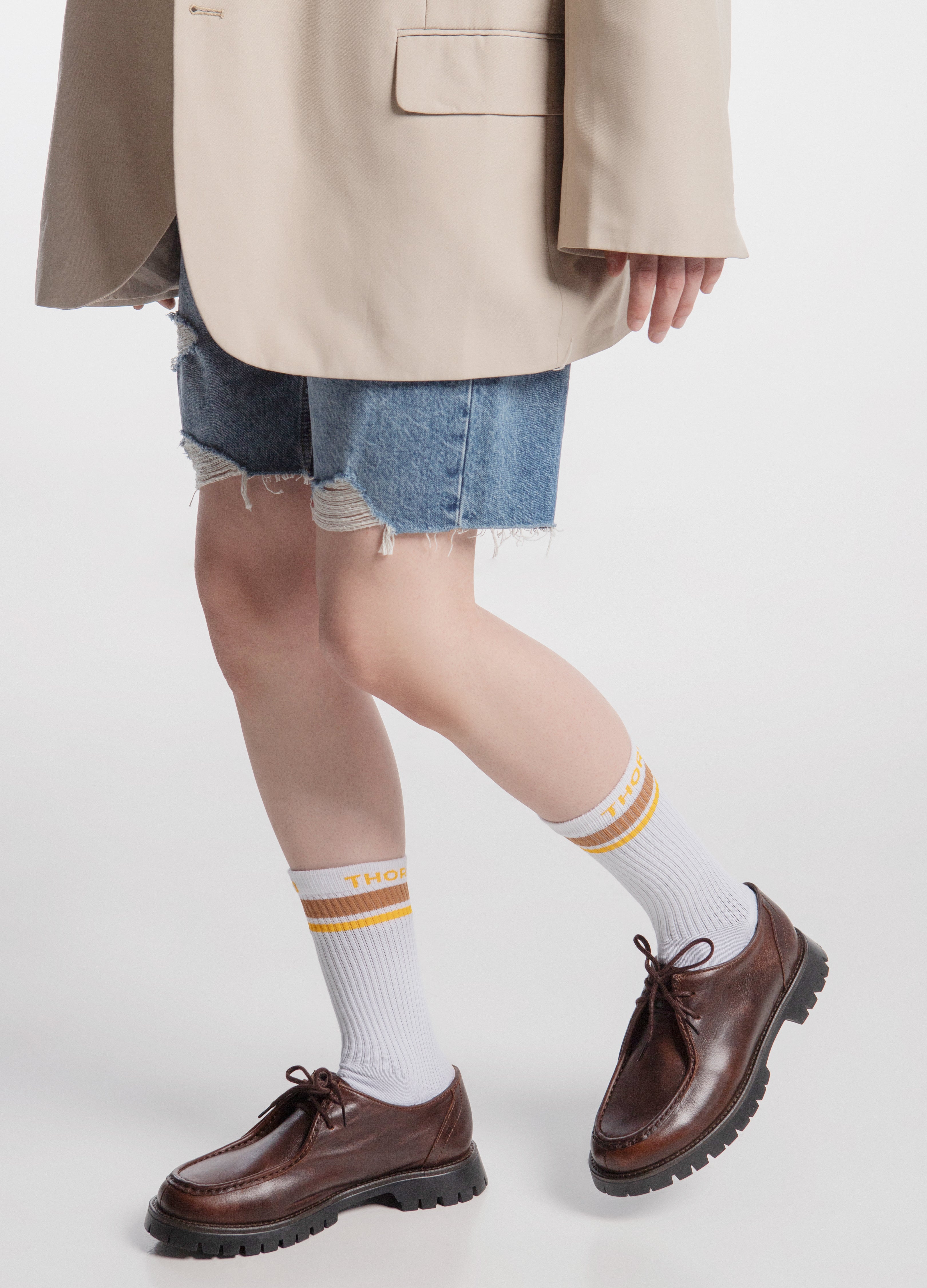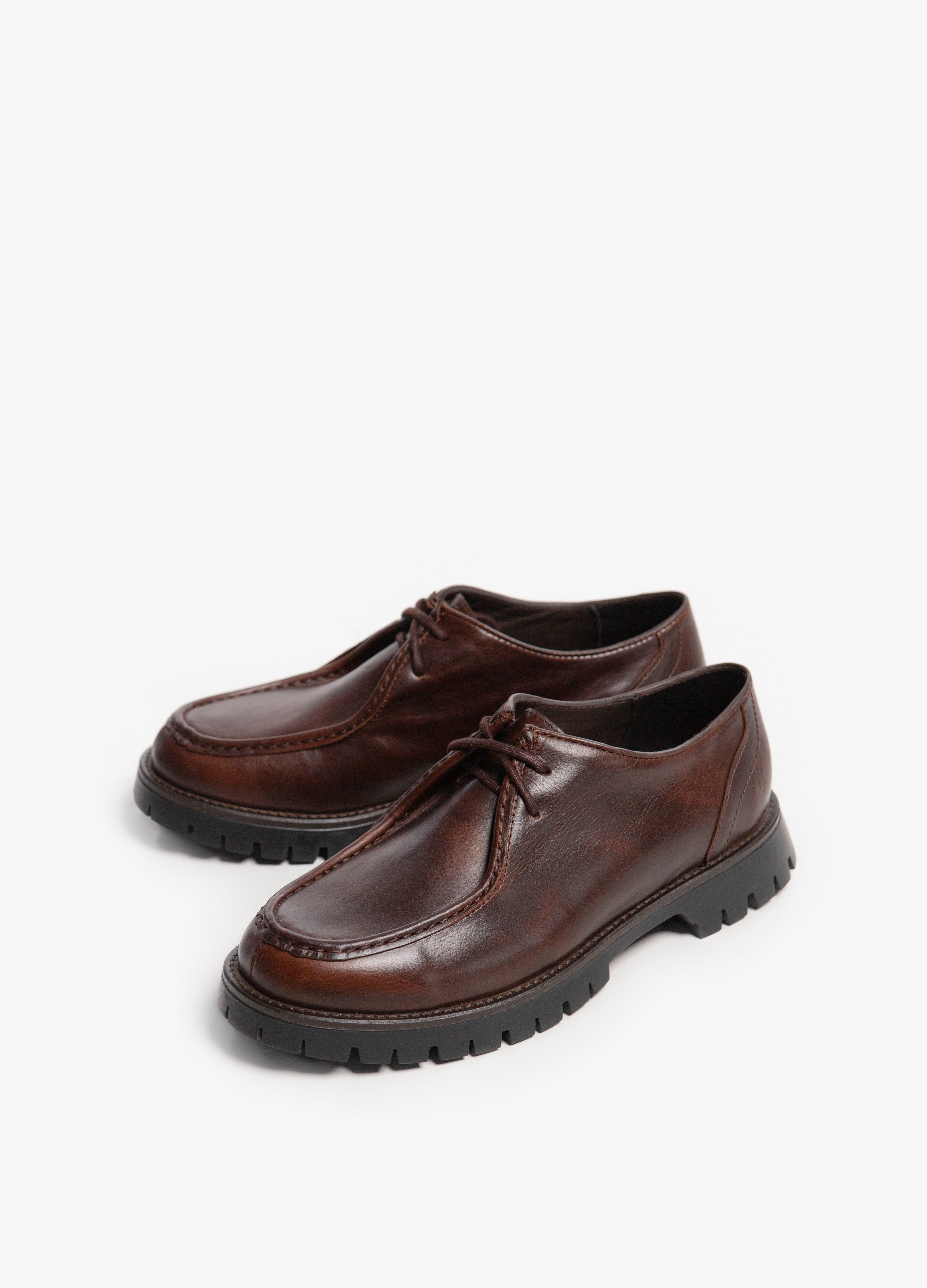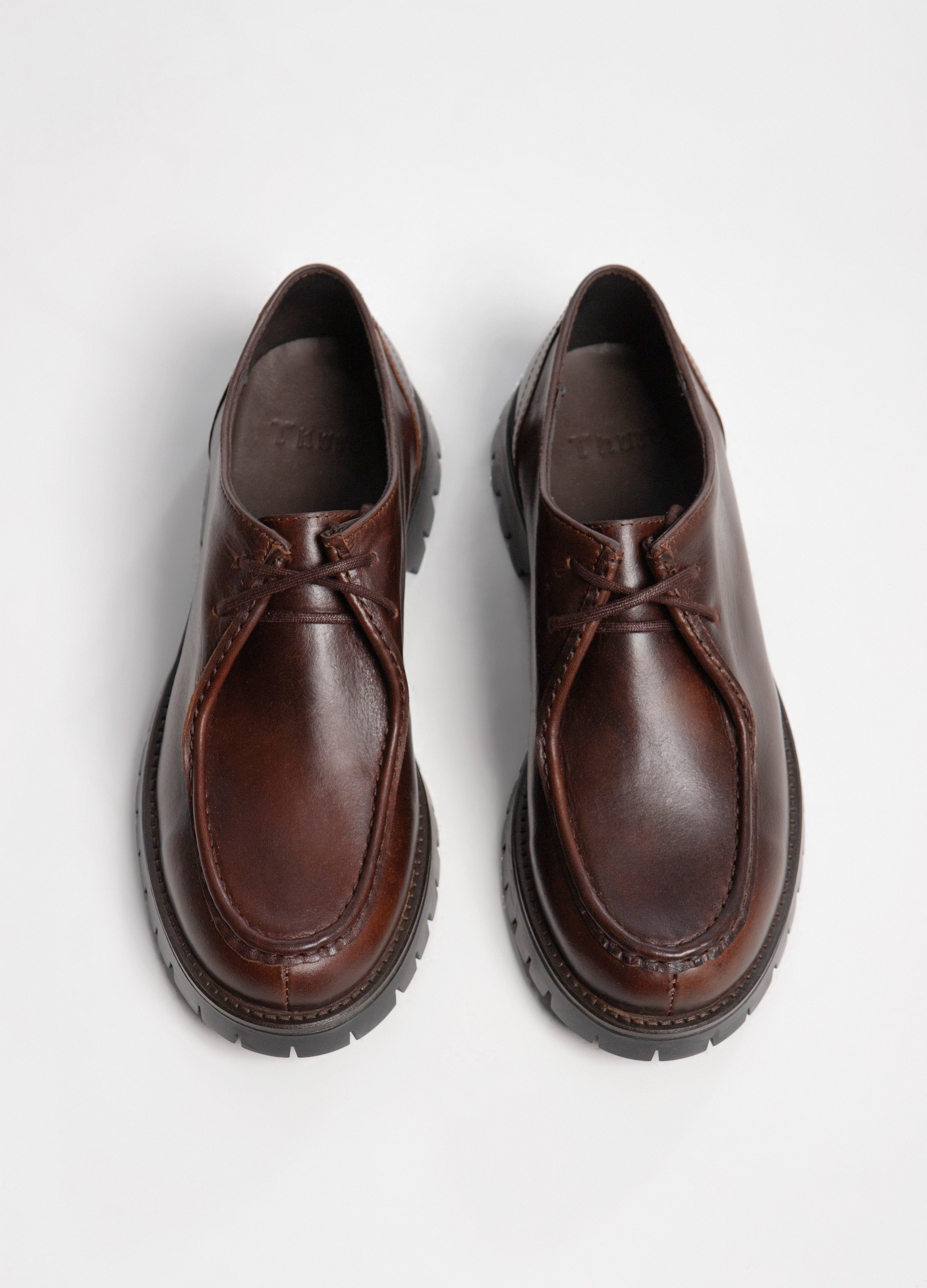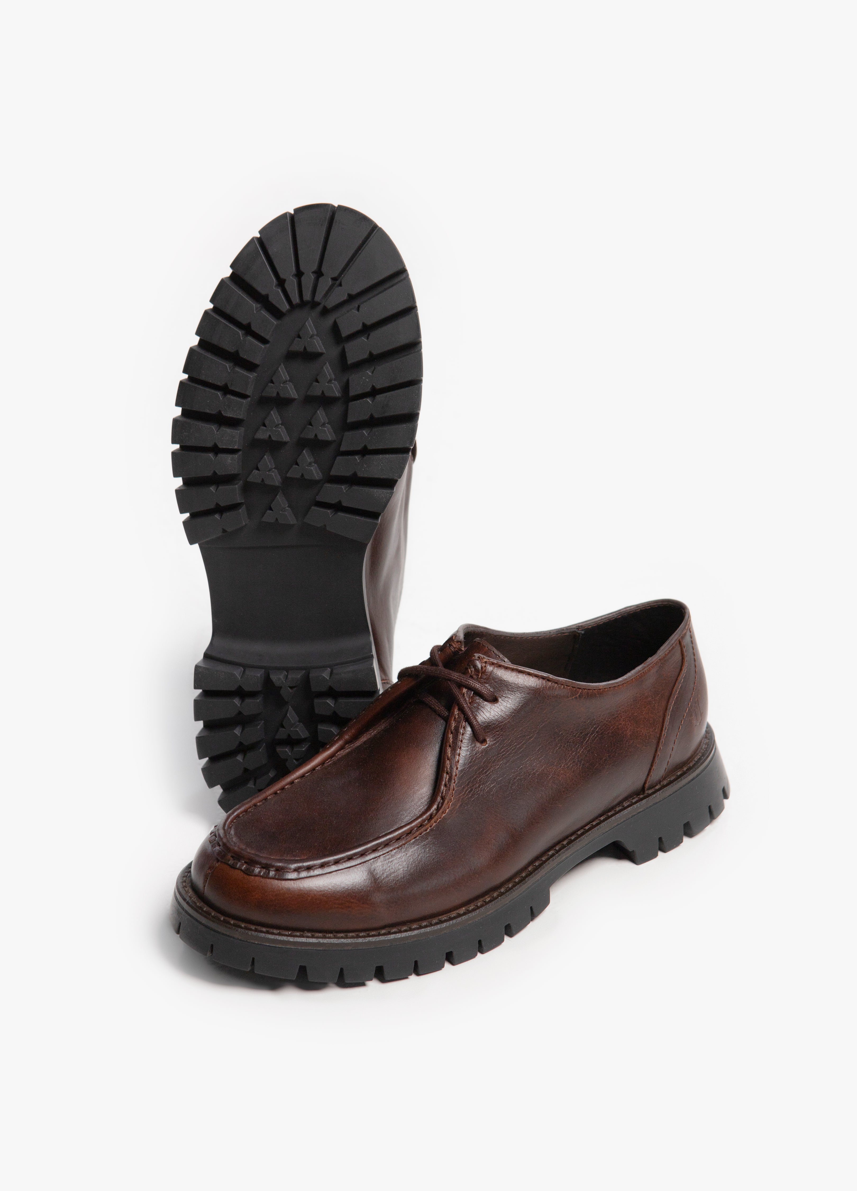Wallabee style shoe made of brown cowhide with a thick rubber sole.