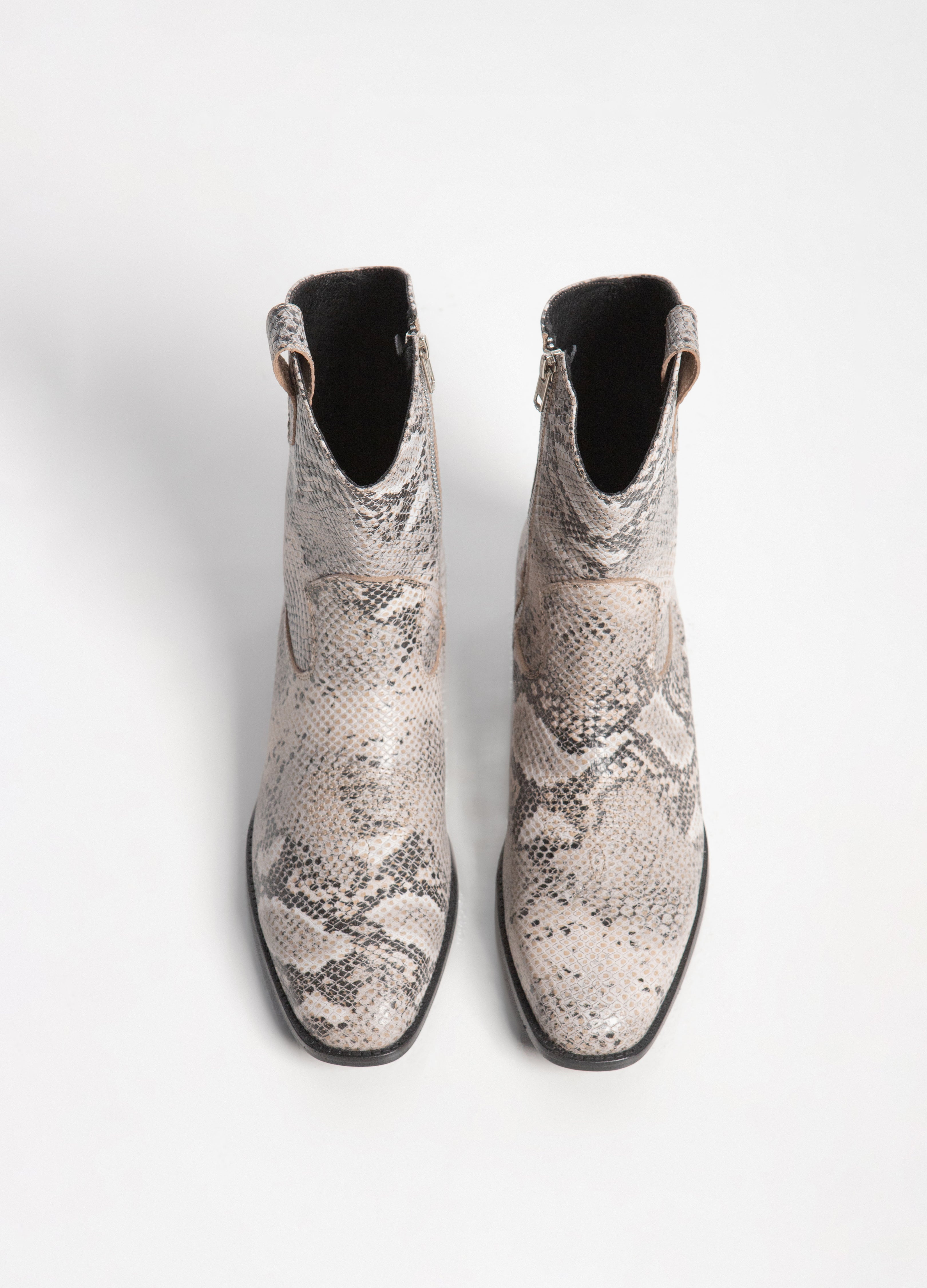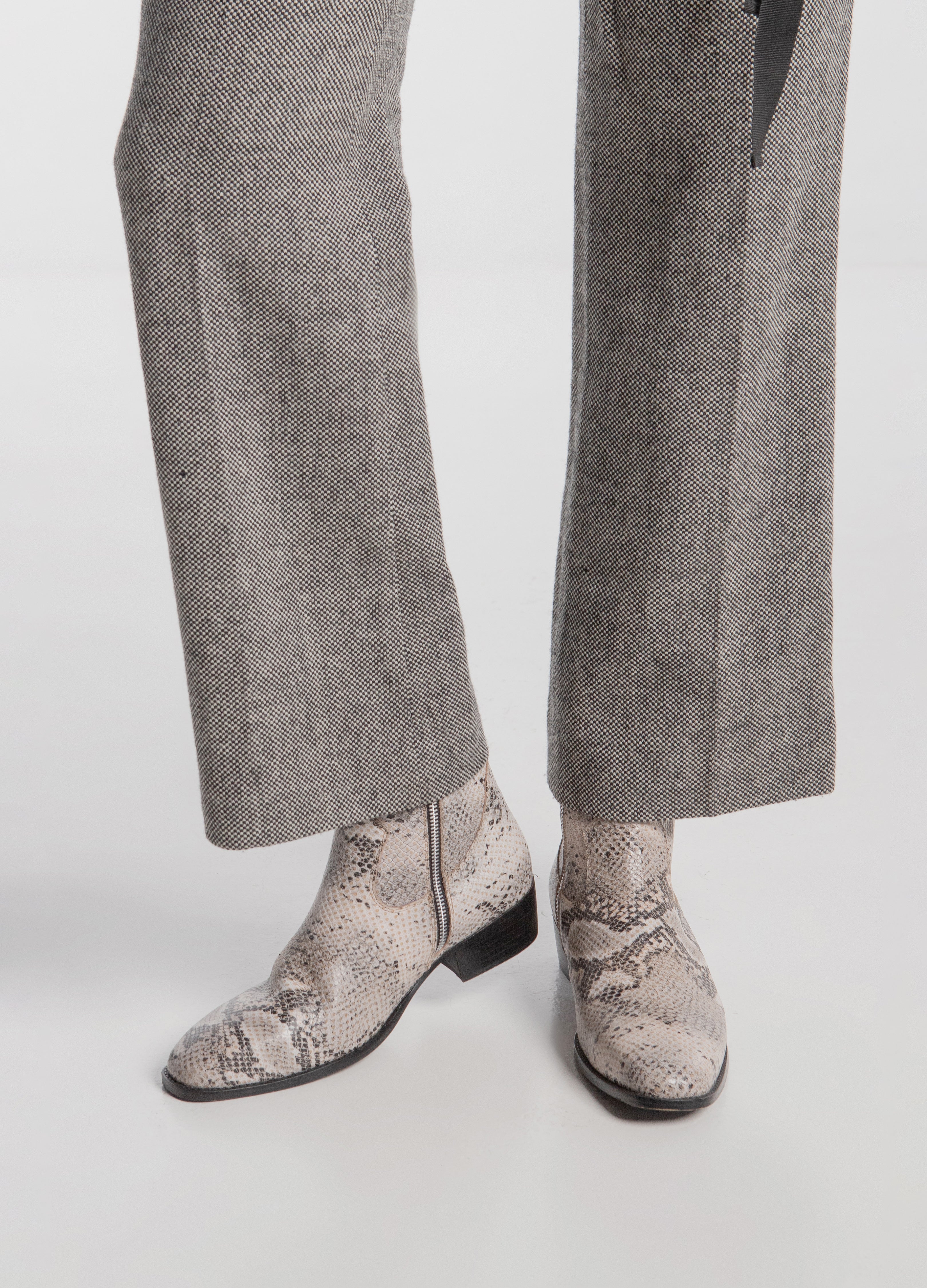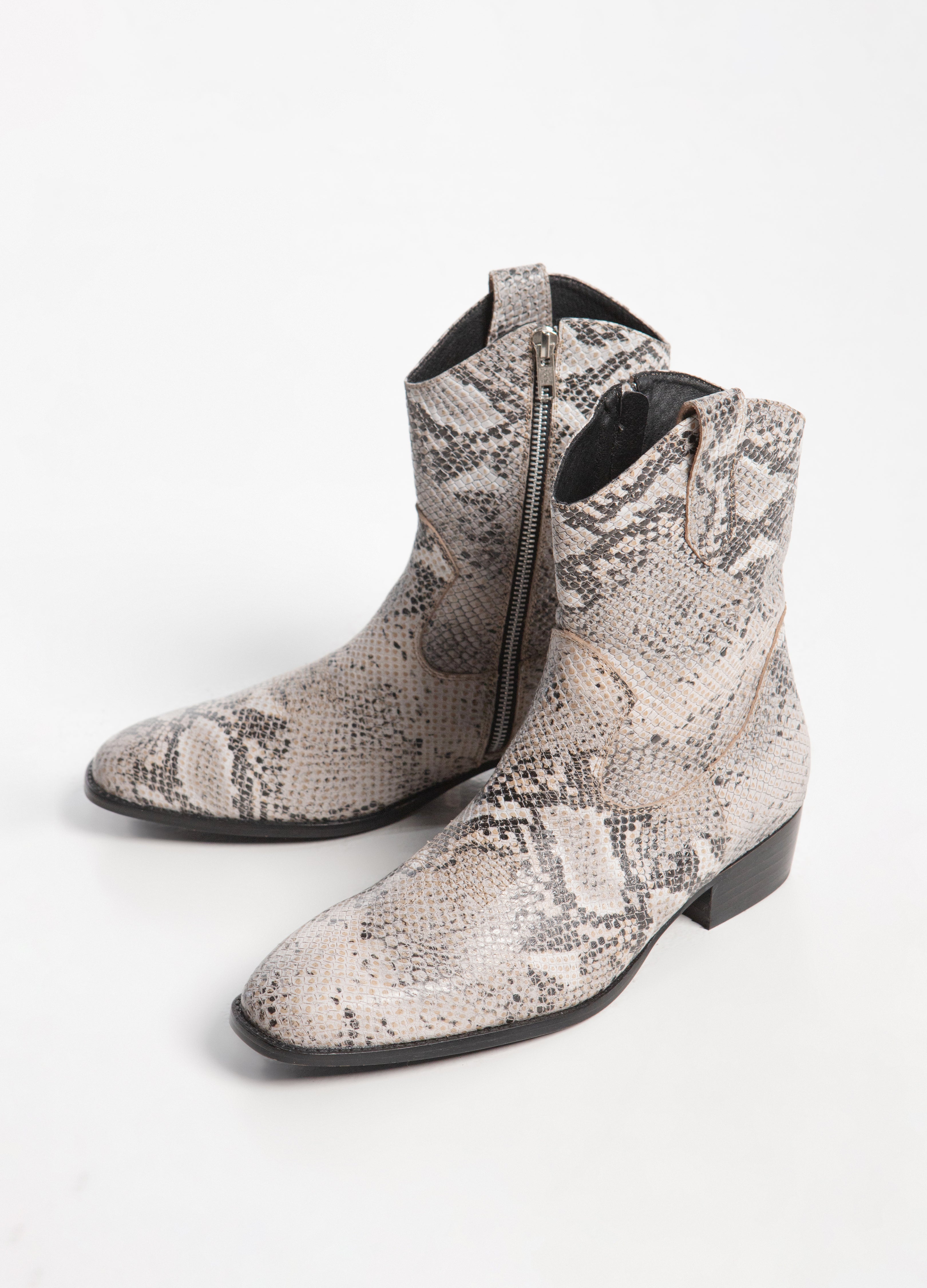 Chelsea style boot made of cowhide with a beige cobra design and finish with a silver side closure and the emblematic Thoro plaque on the sole.