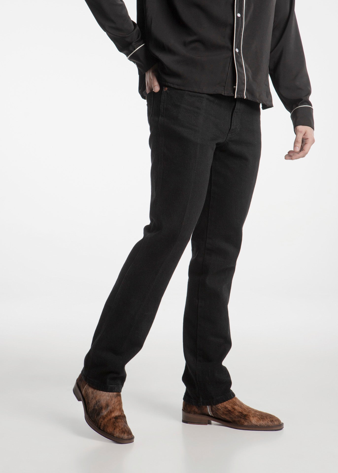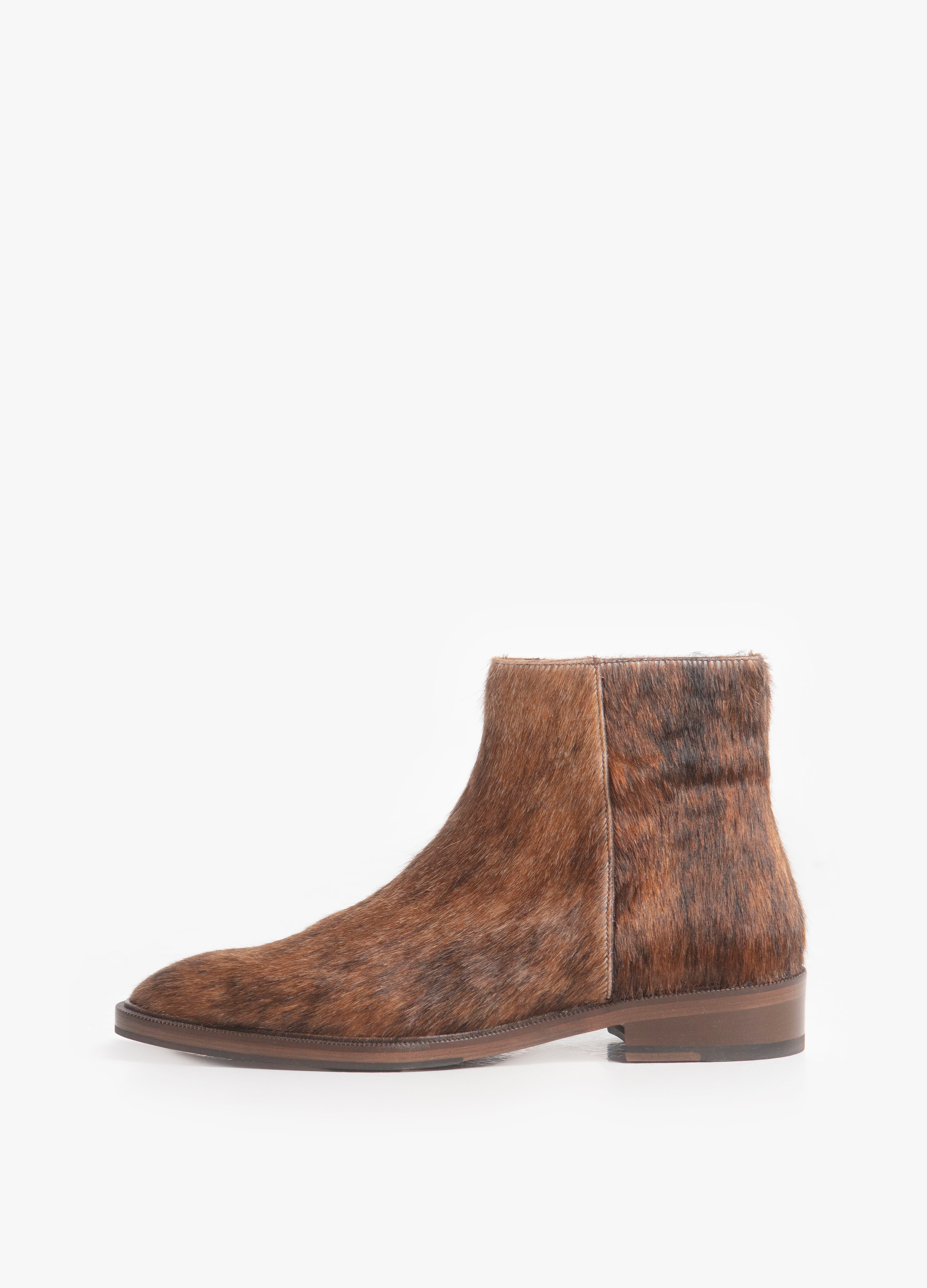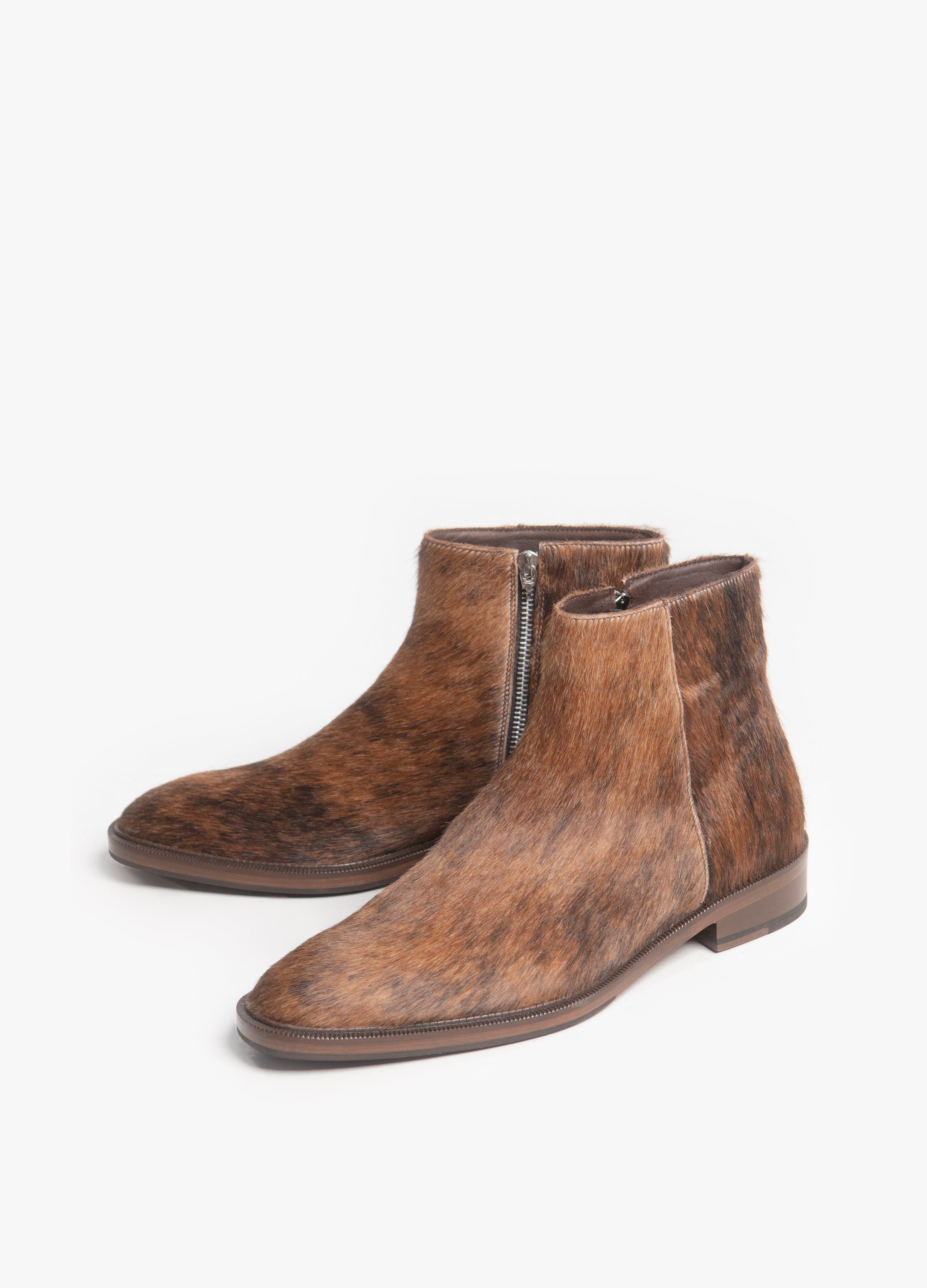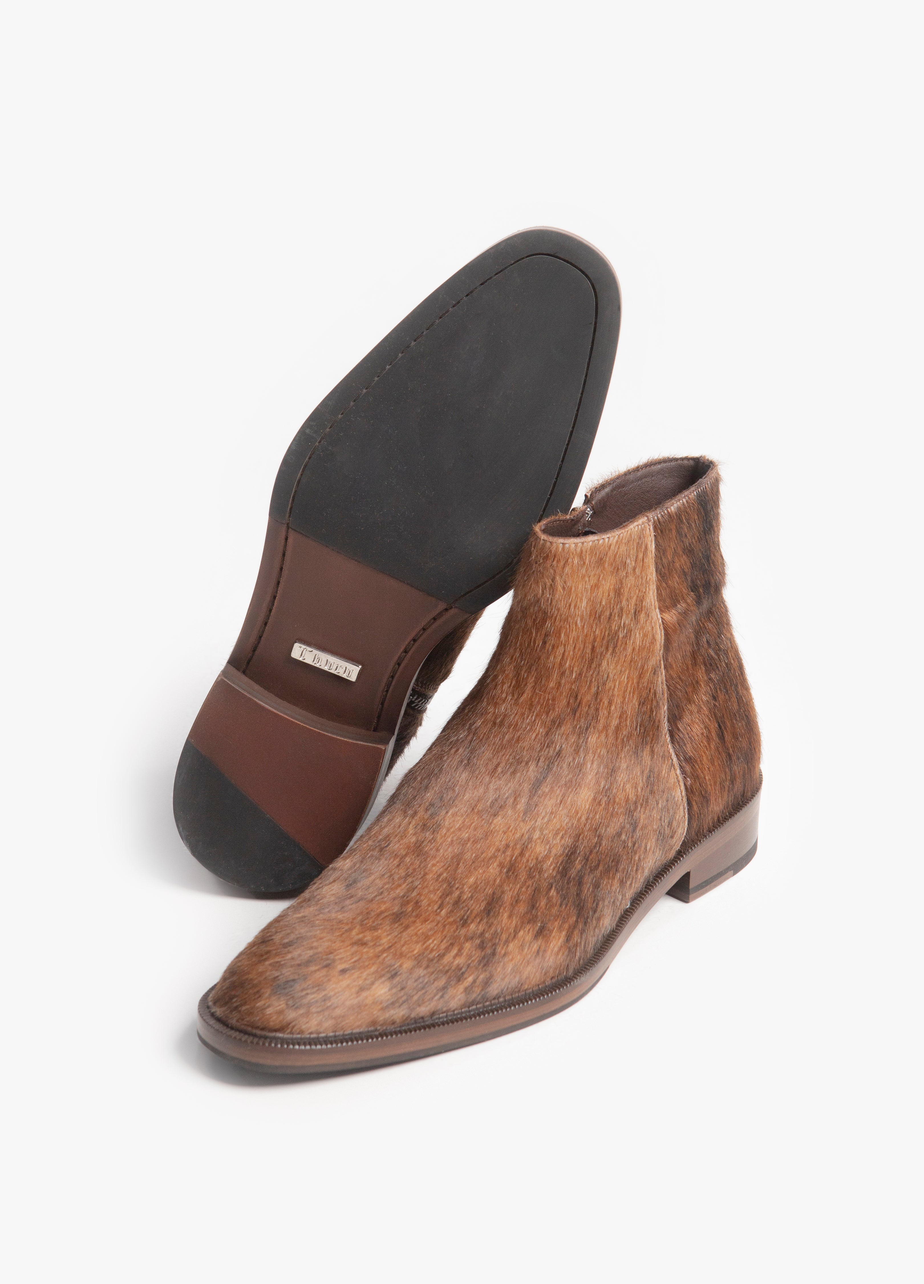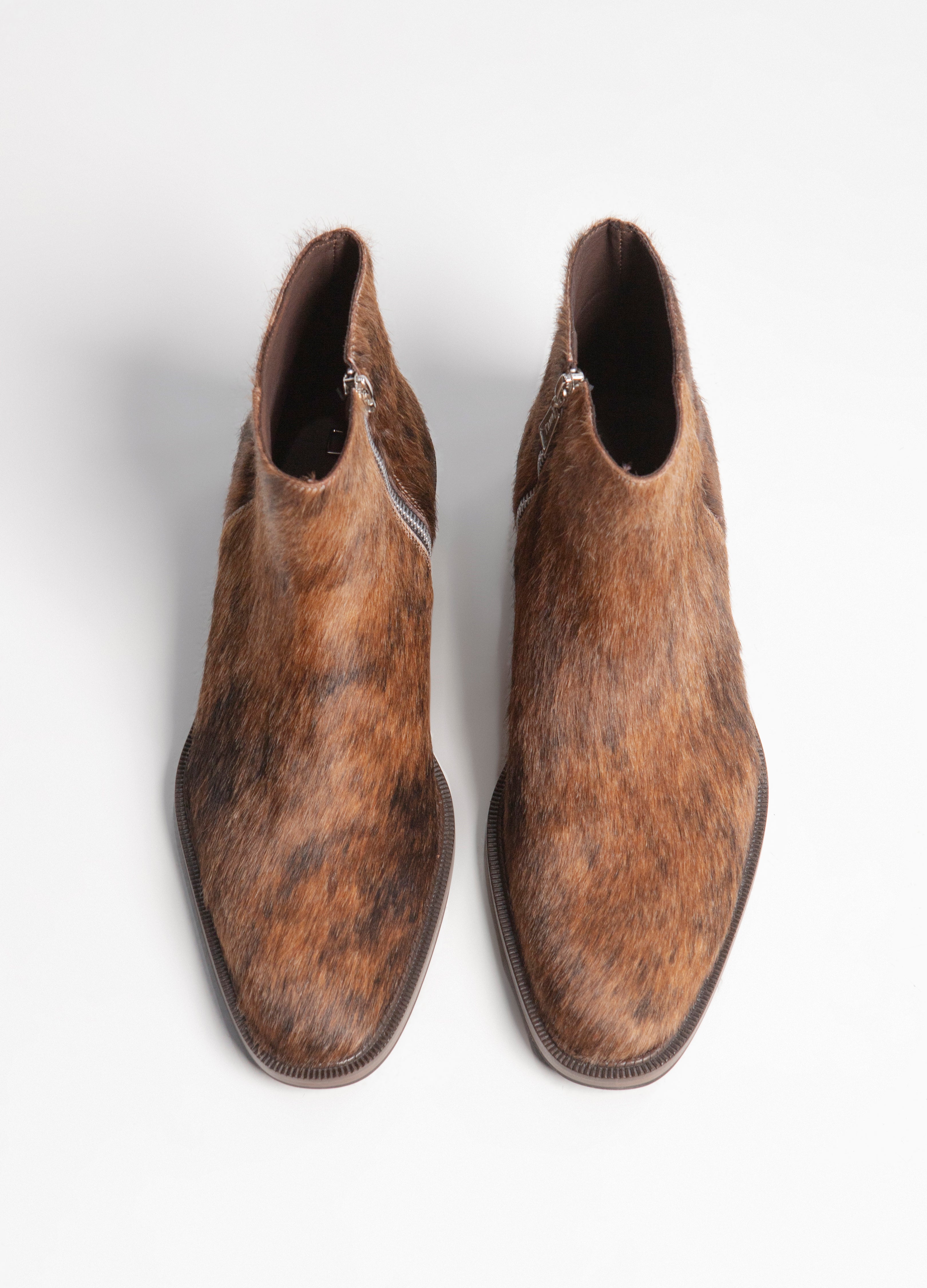 Confeccionado en piel recubierta con un exquisito pelaje de res con apariencia de coyote, cada par es único. El patrón de pelo, con sus ricas tonalidades marrones, caramelo y ébano, rinde homenaje al habitante más astuto y solitario del desierto. Este pelaje no solo es una declaración de textura visual, sino que también ofrece un toque táctil de lujo salvaje.