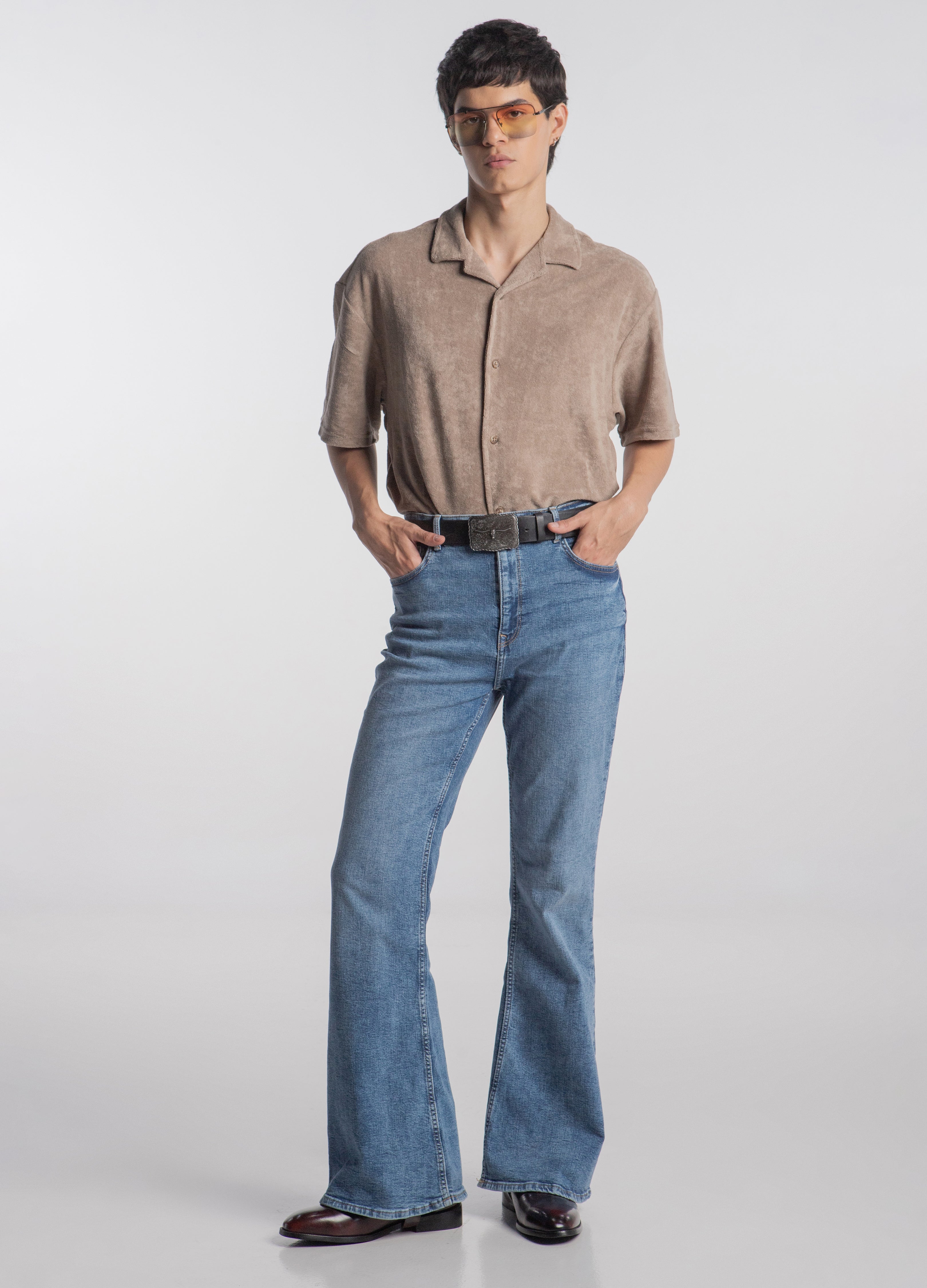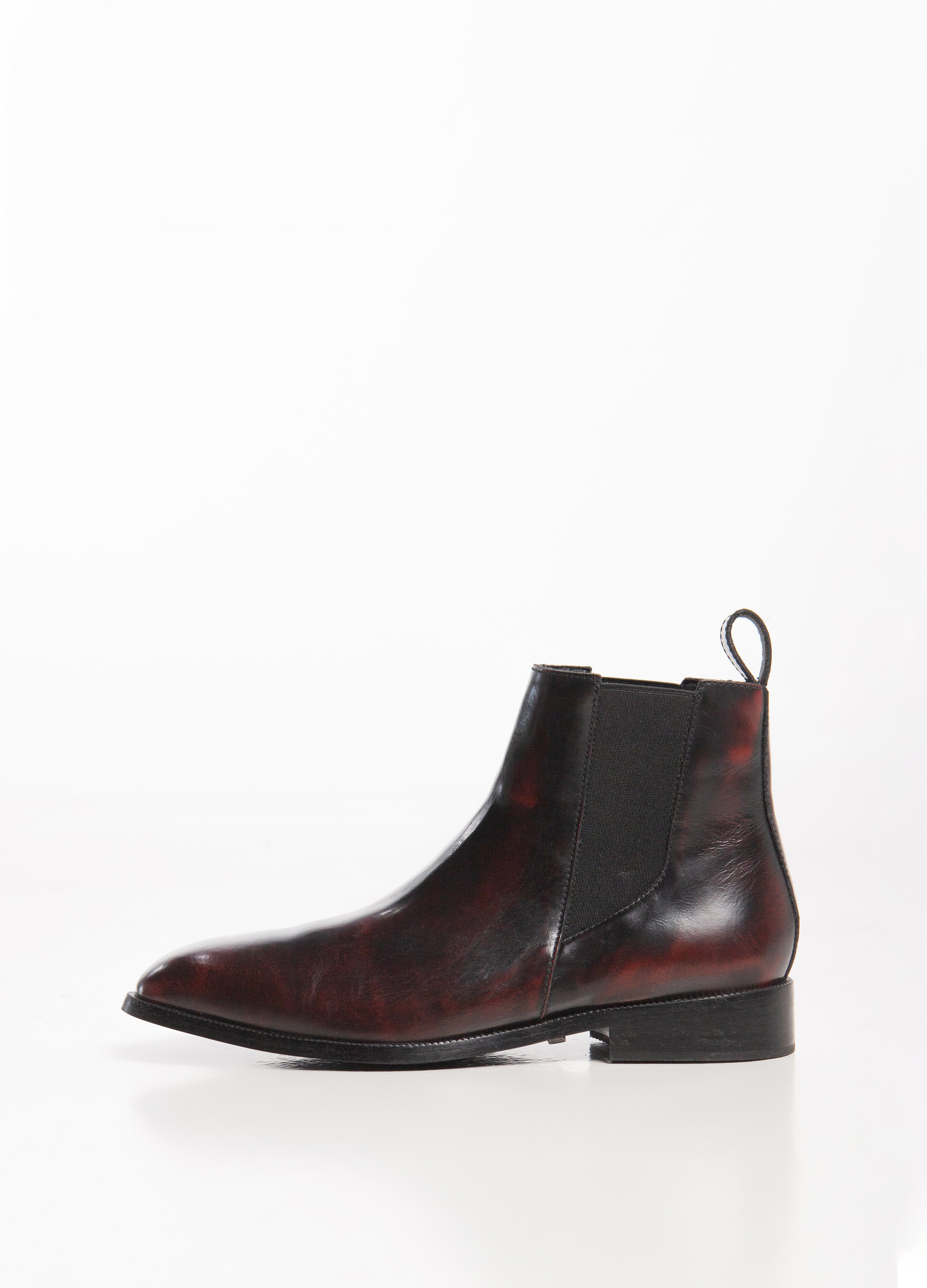 Chelsea boot made of wine-colored cowhide with a shiny, veined finish with harness and removable ring.