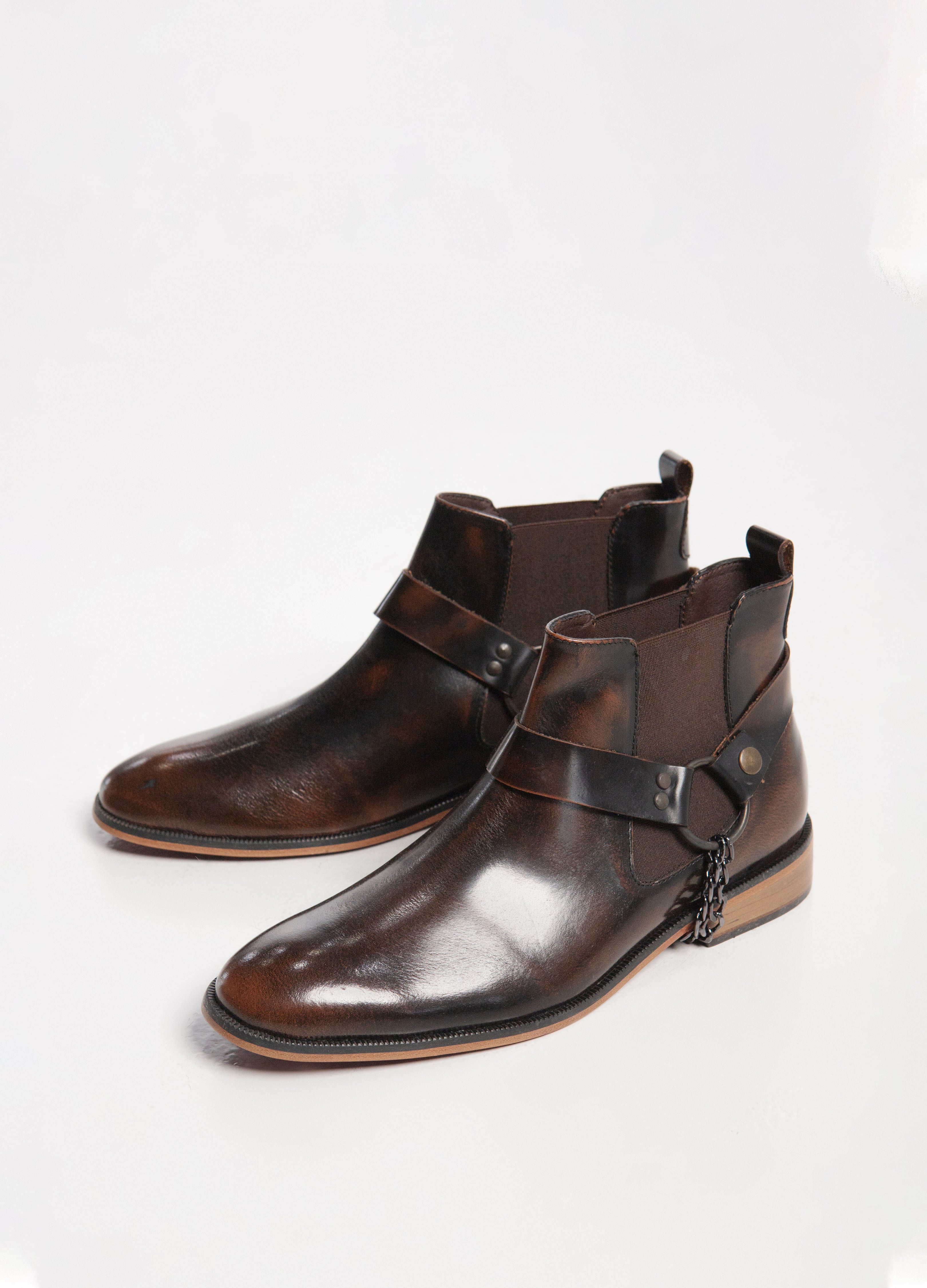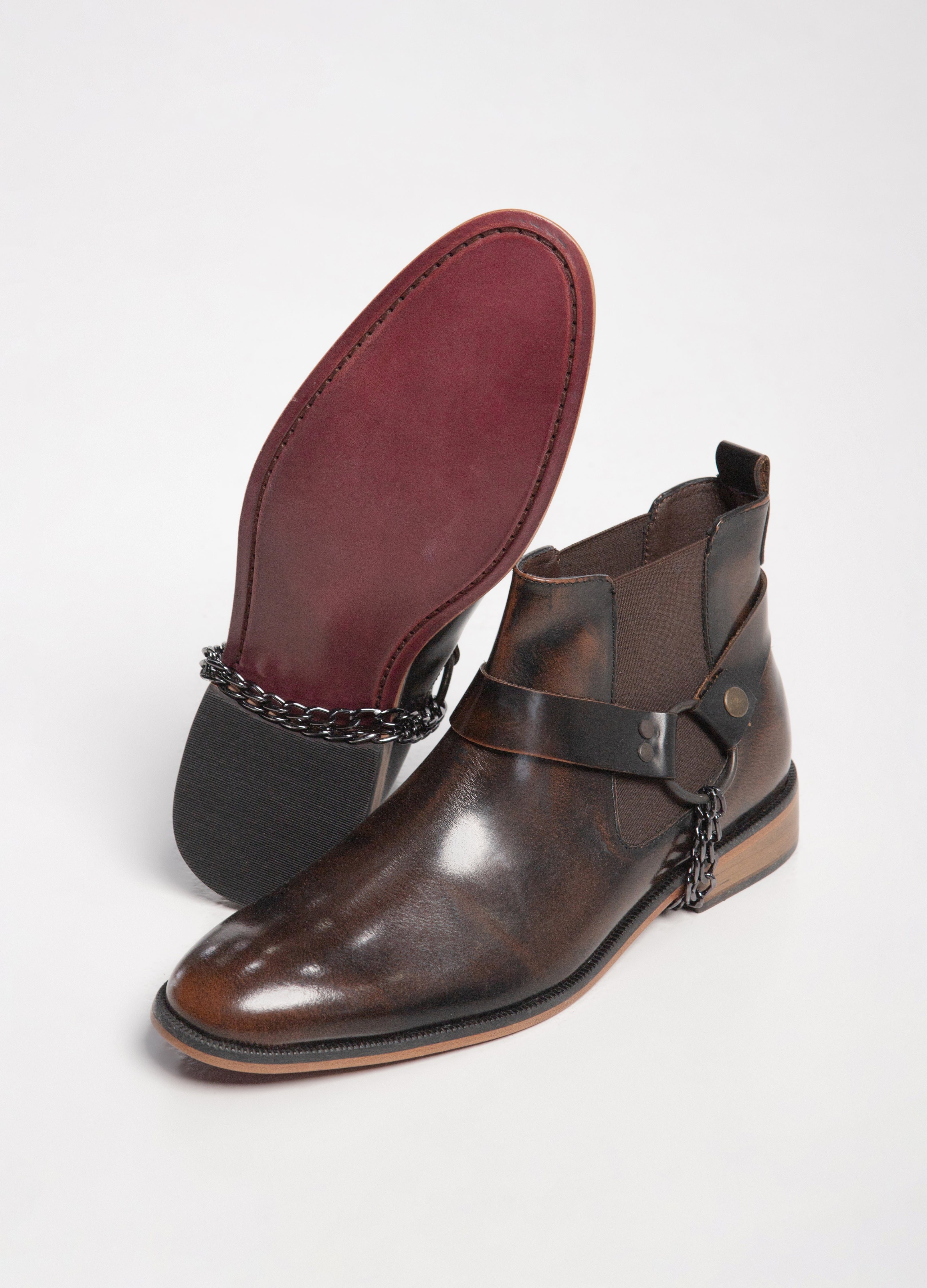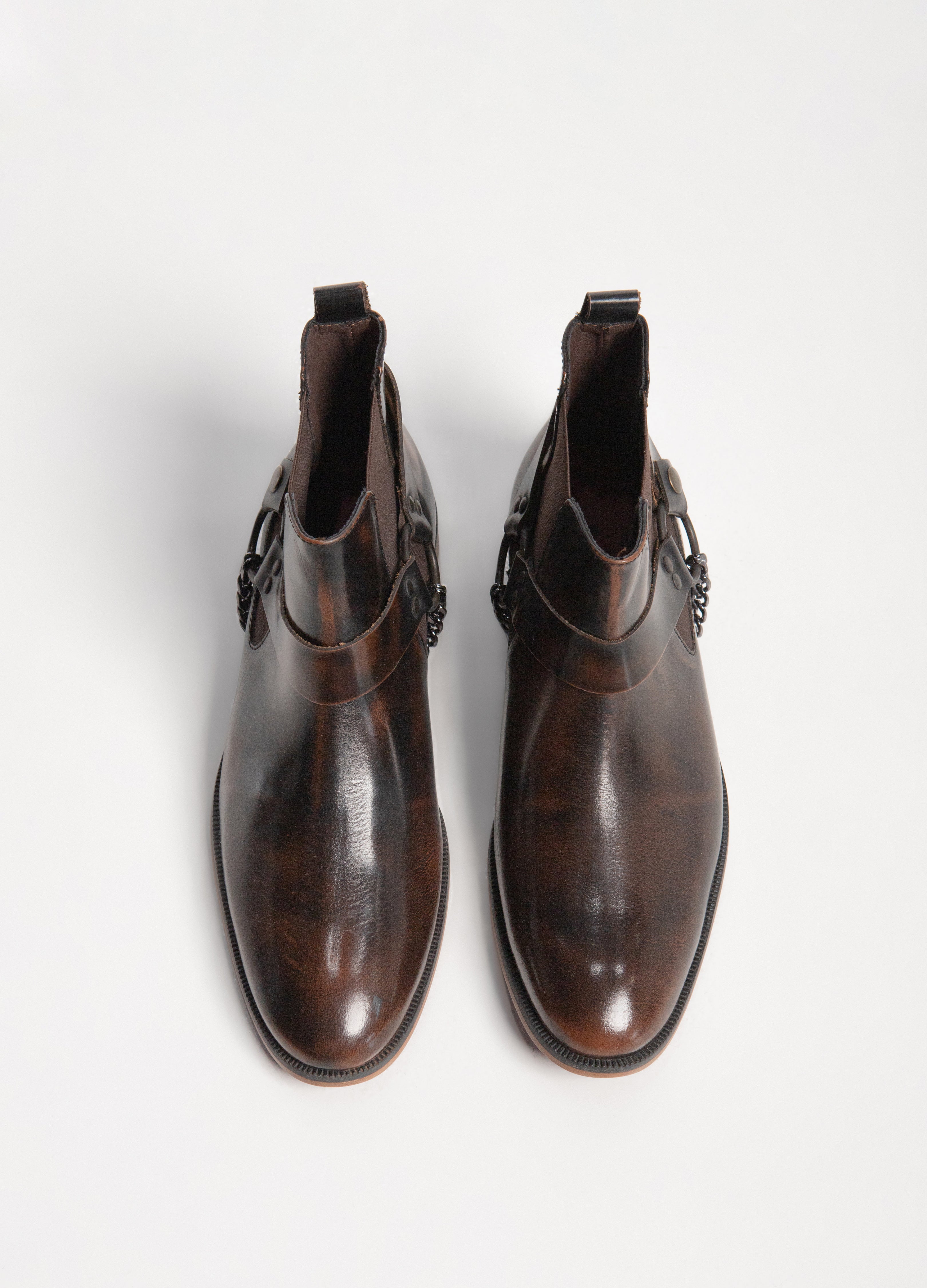 Chelsea boot made of brown cowhide with a shiny veined finish and a harness with a removable ring and chains.