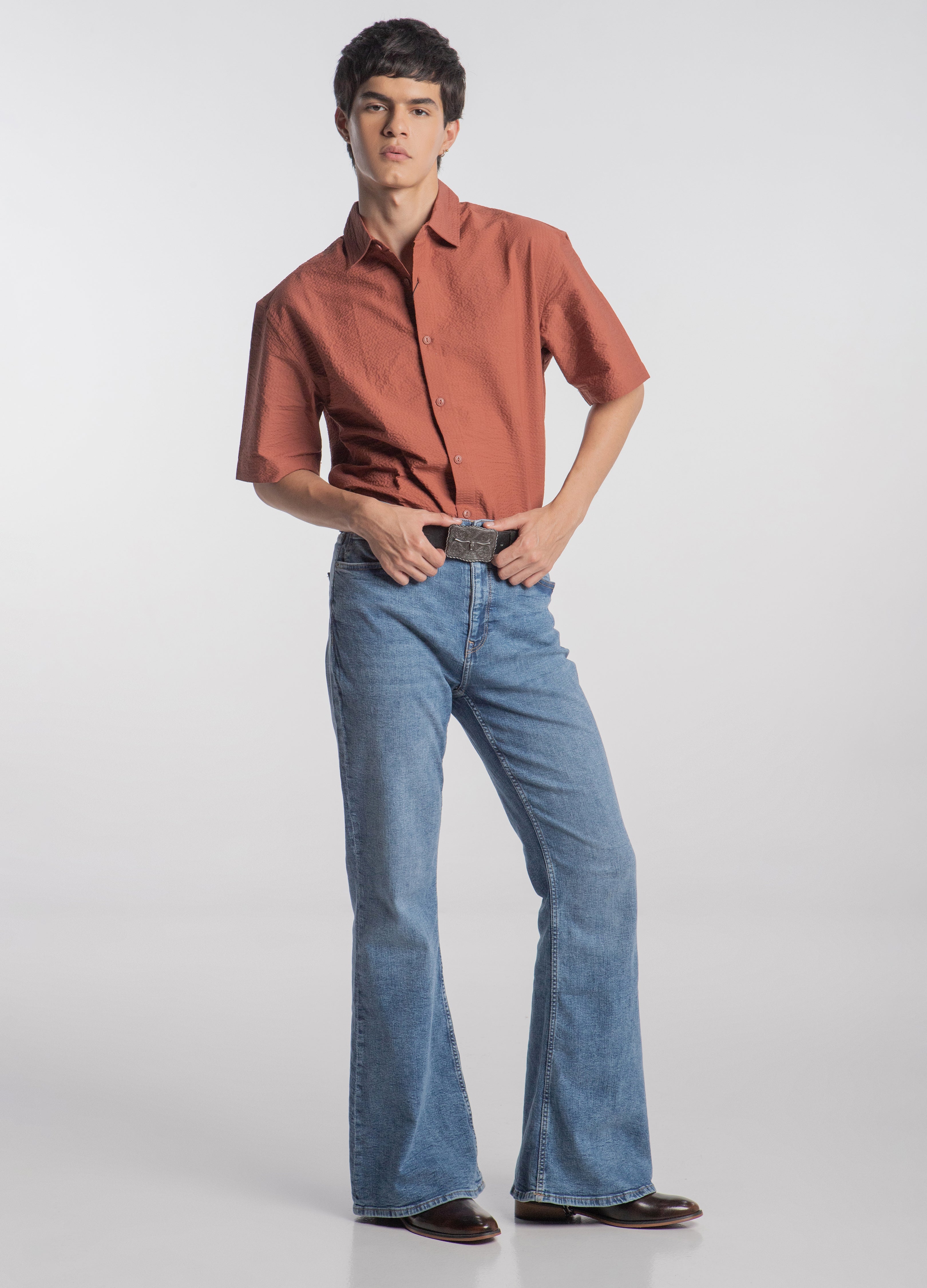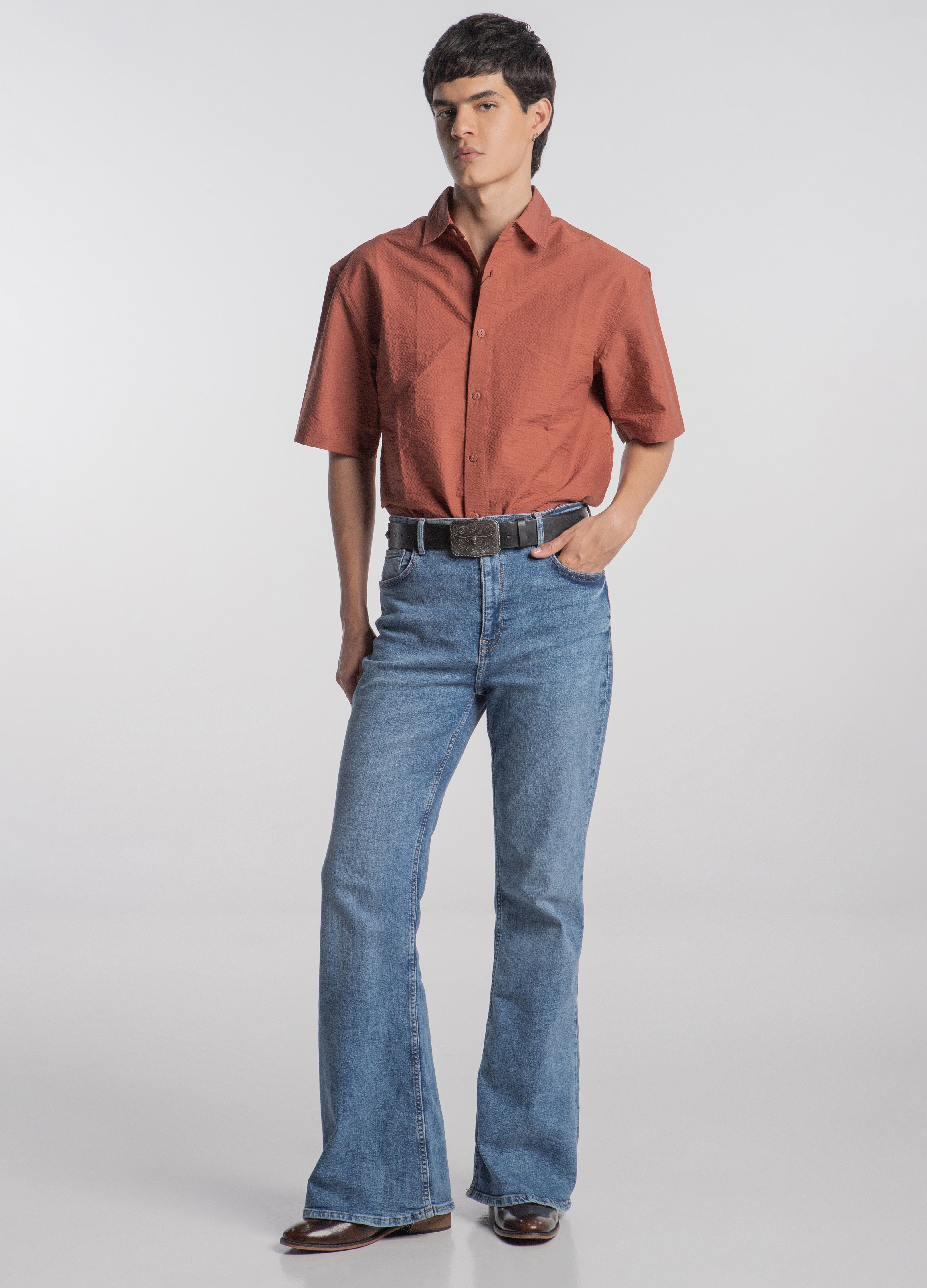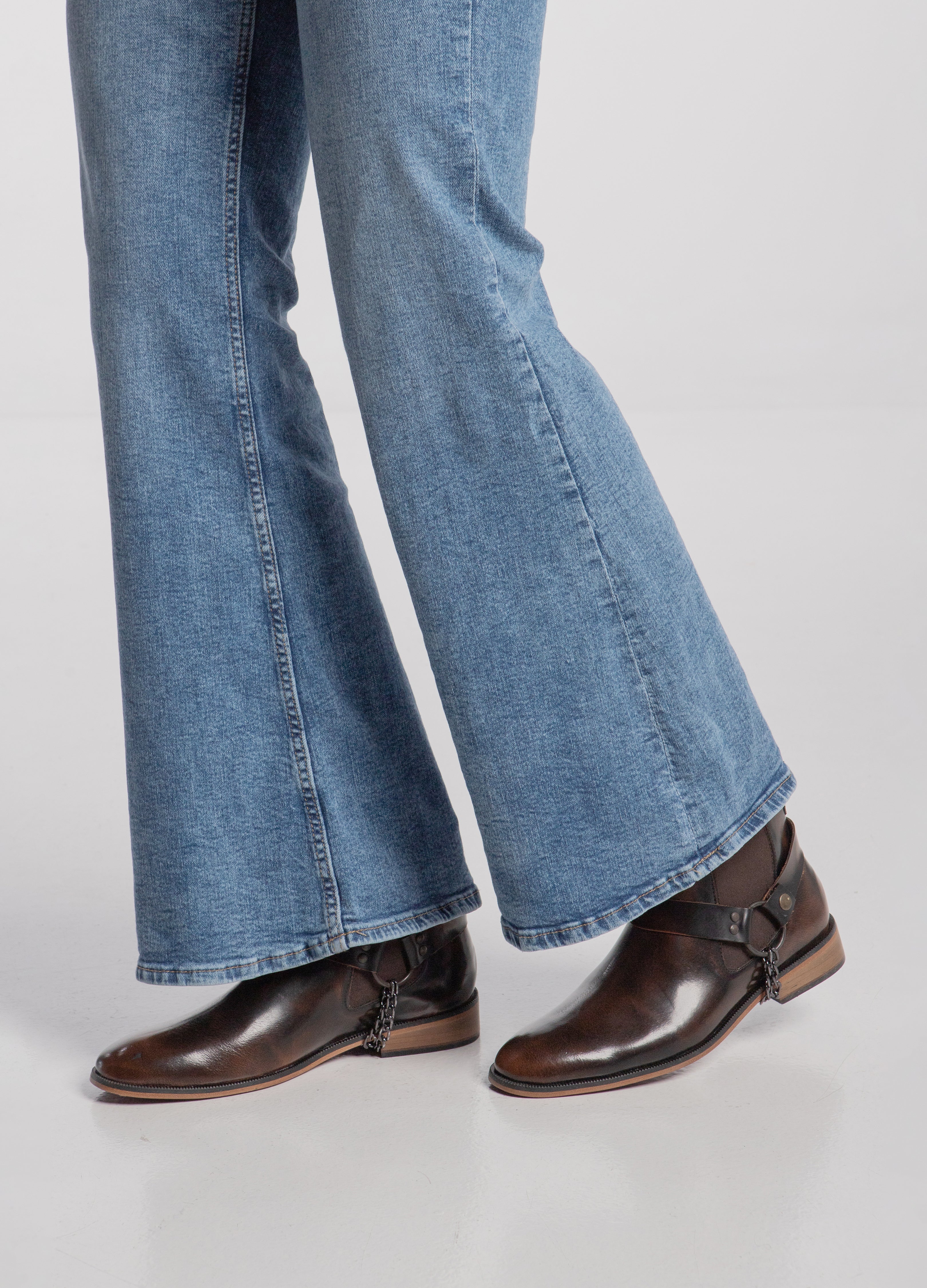 Chelsea boot made of brown cowhide with a shiny veined finish and a harness with a removable ring and chains.