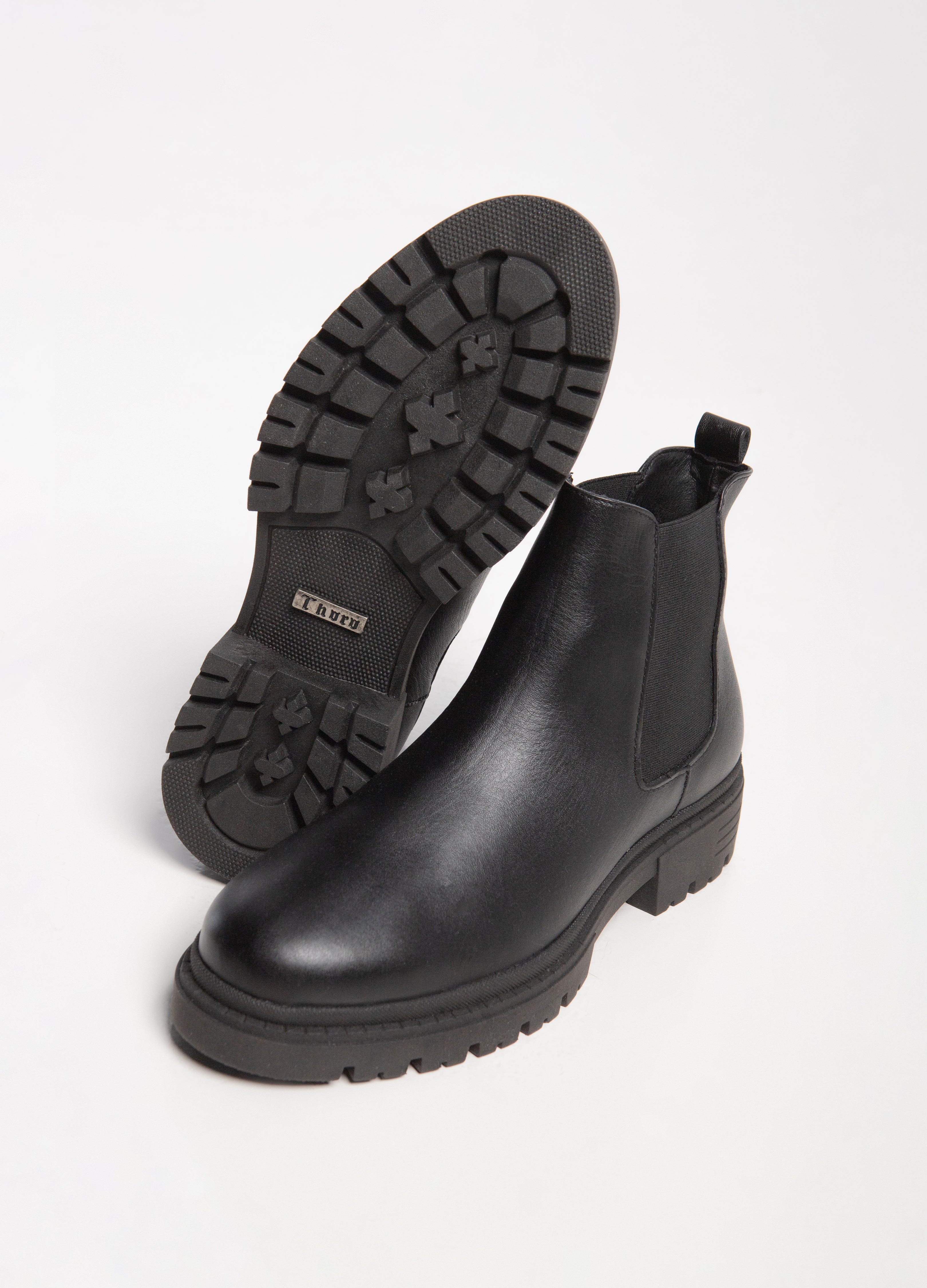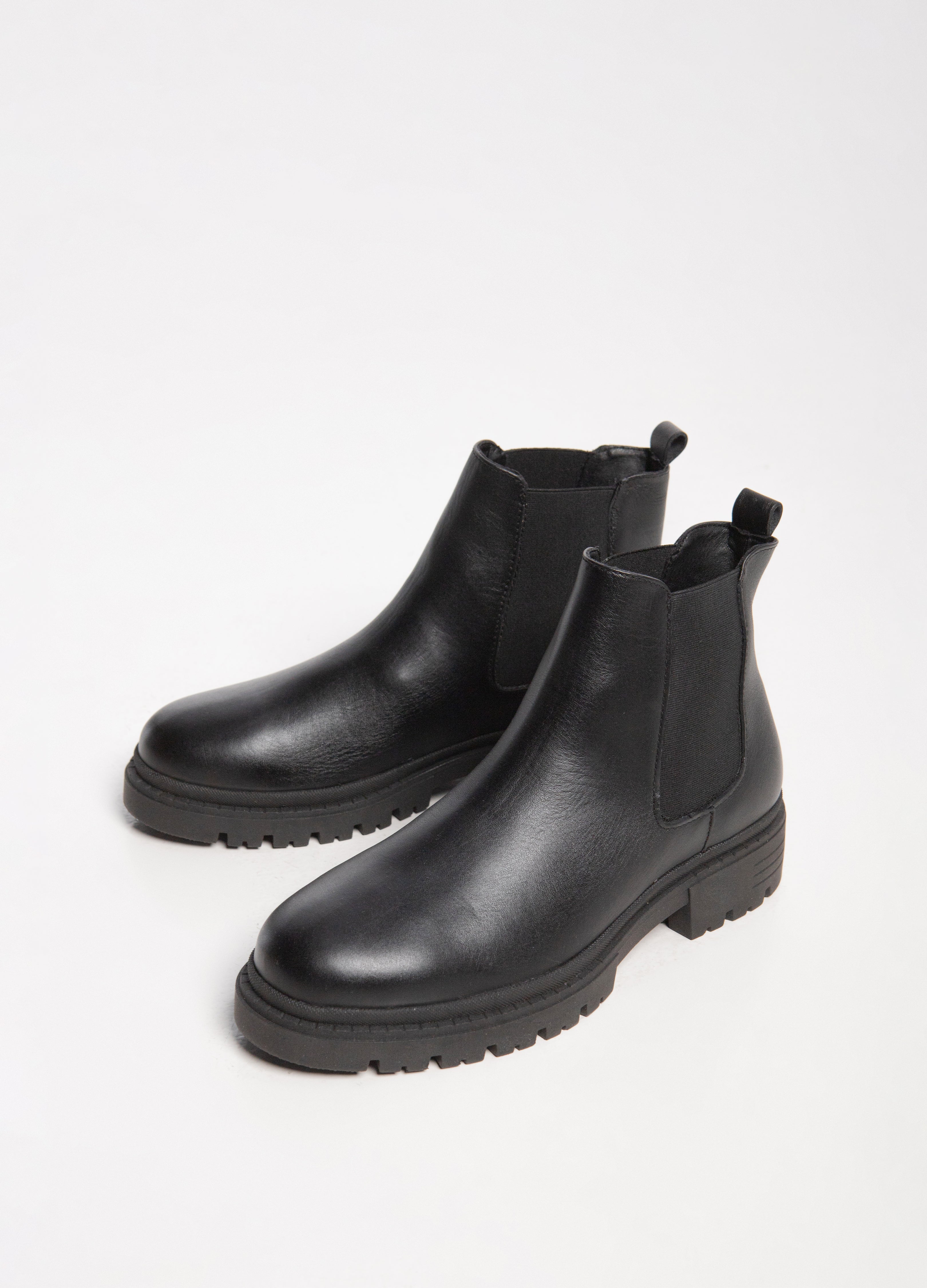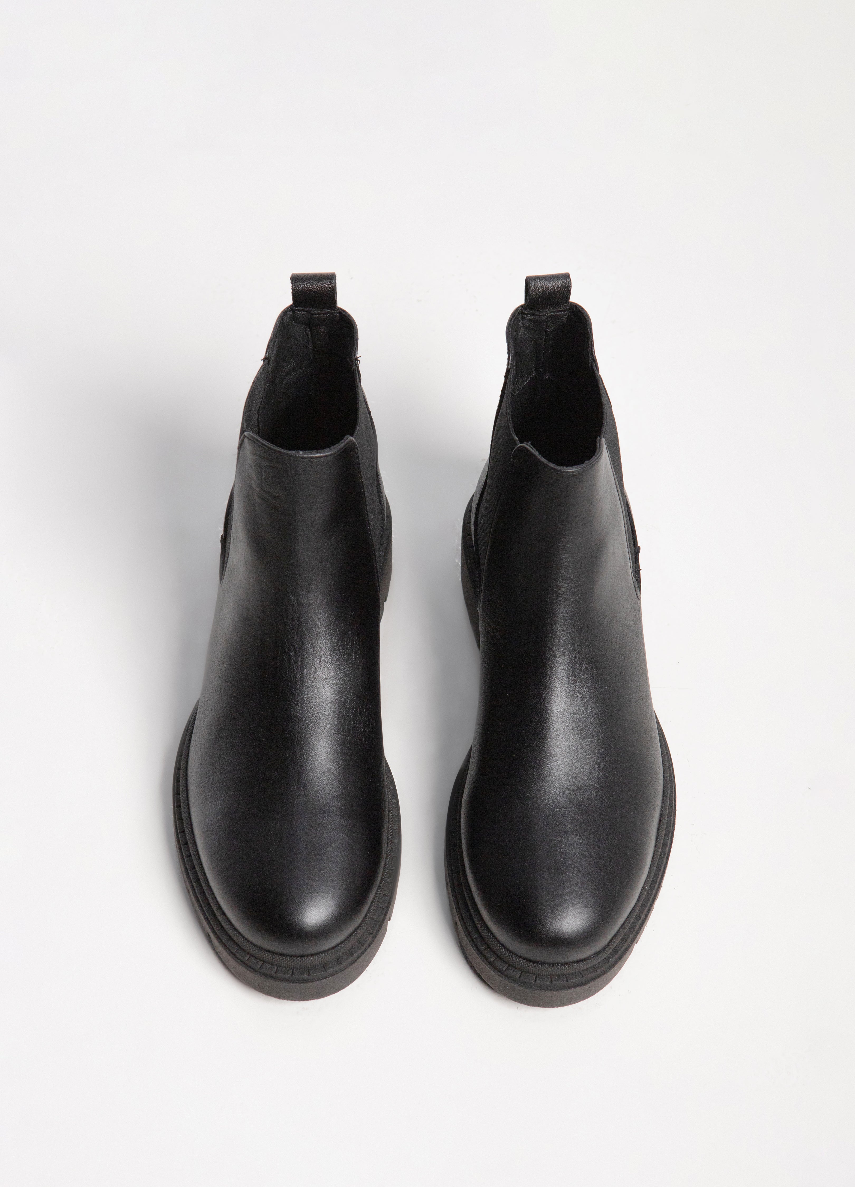 Chelsea boots made of black cowhide with a thick sole and elastic sides.