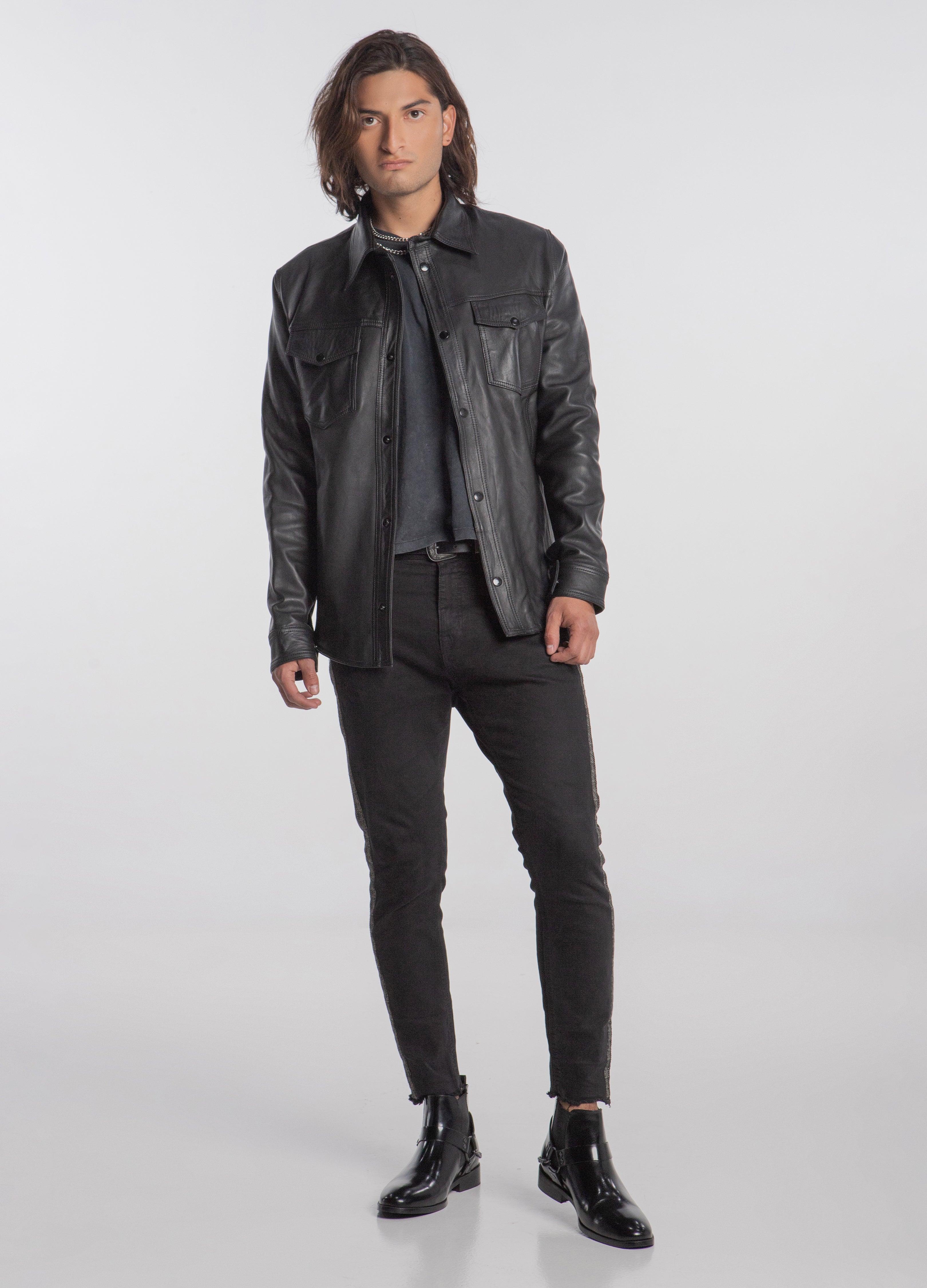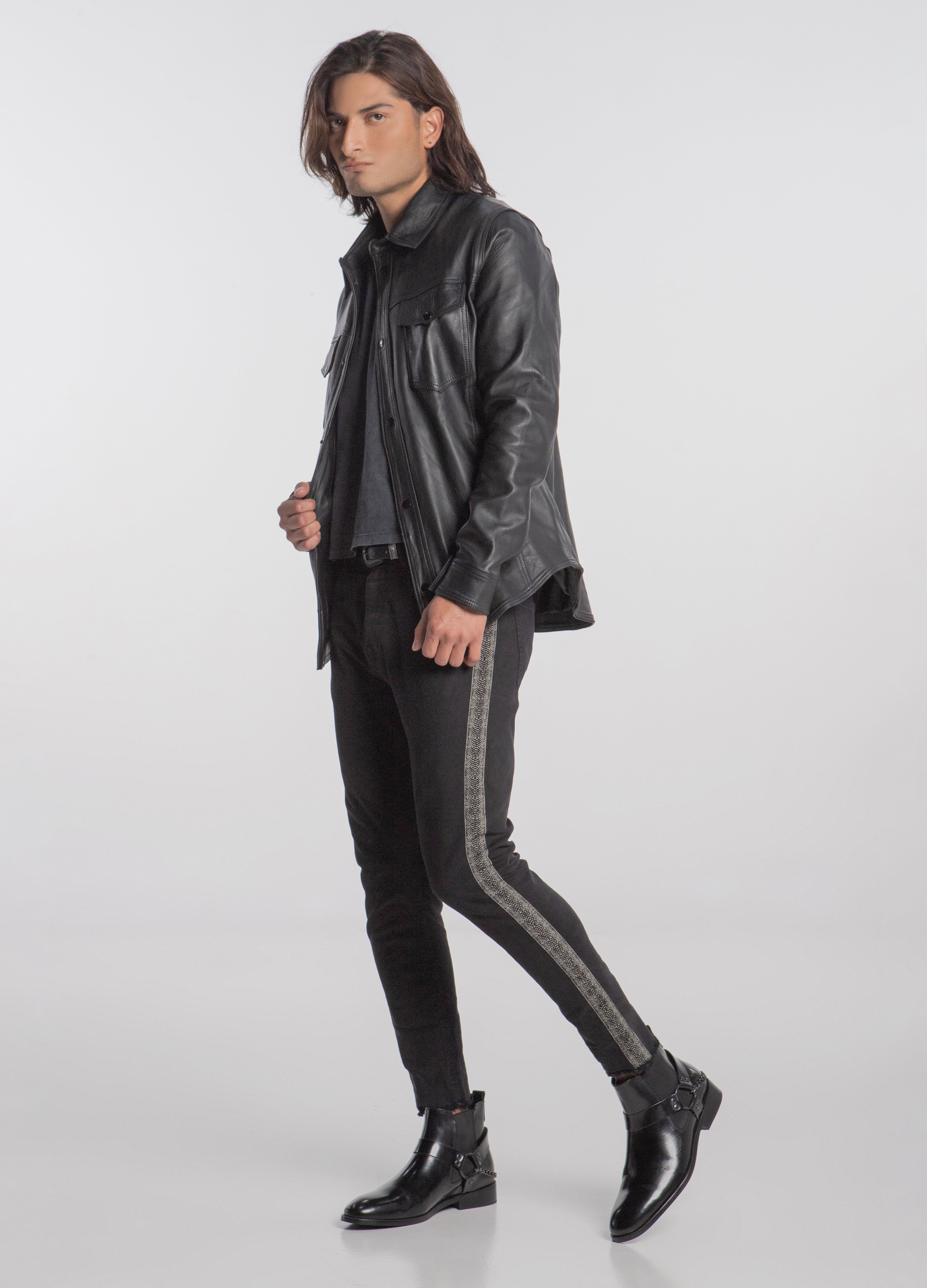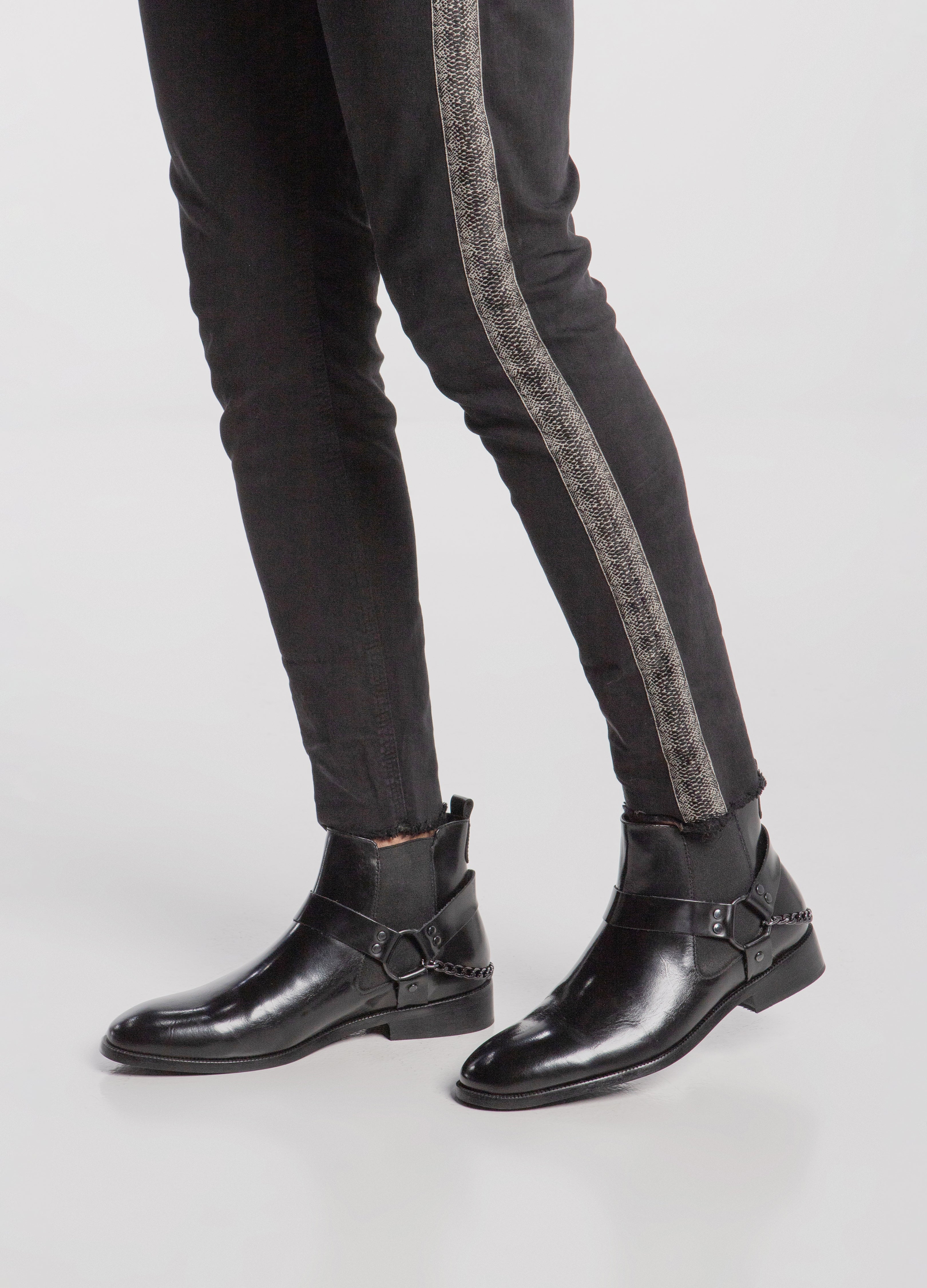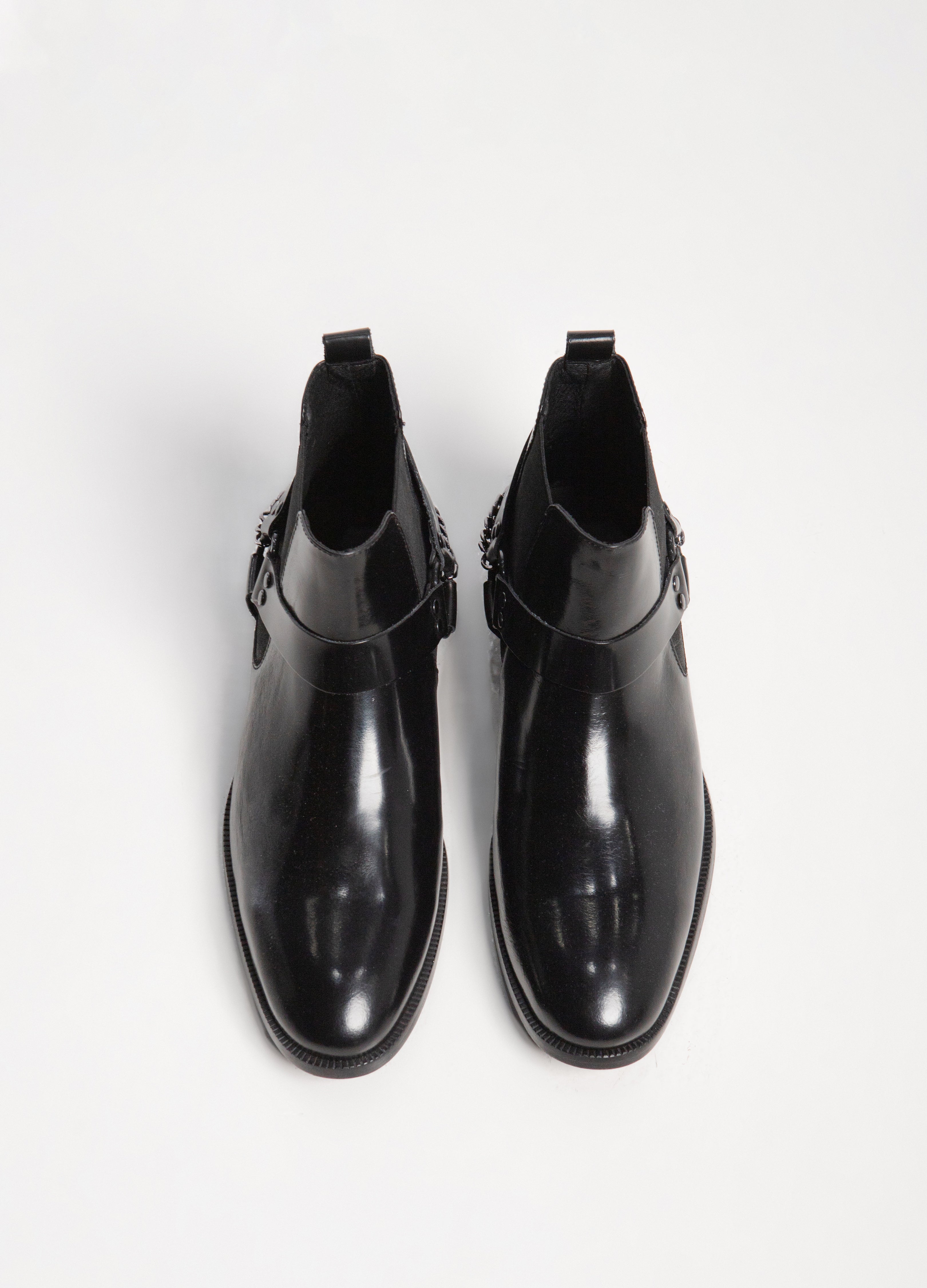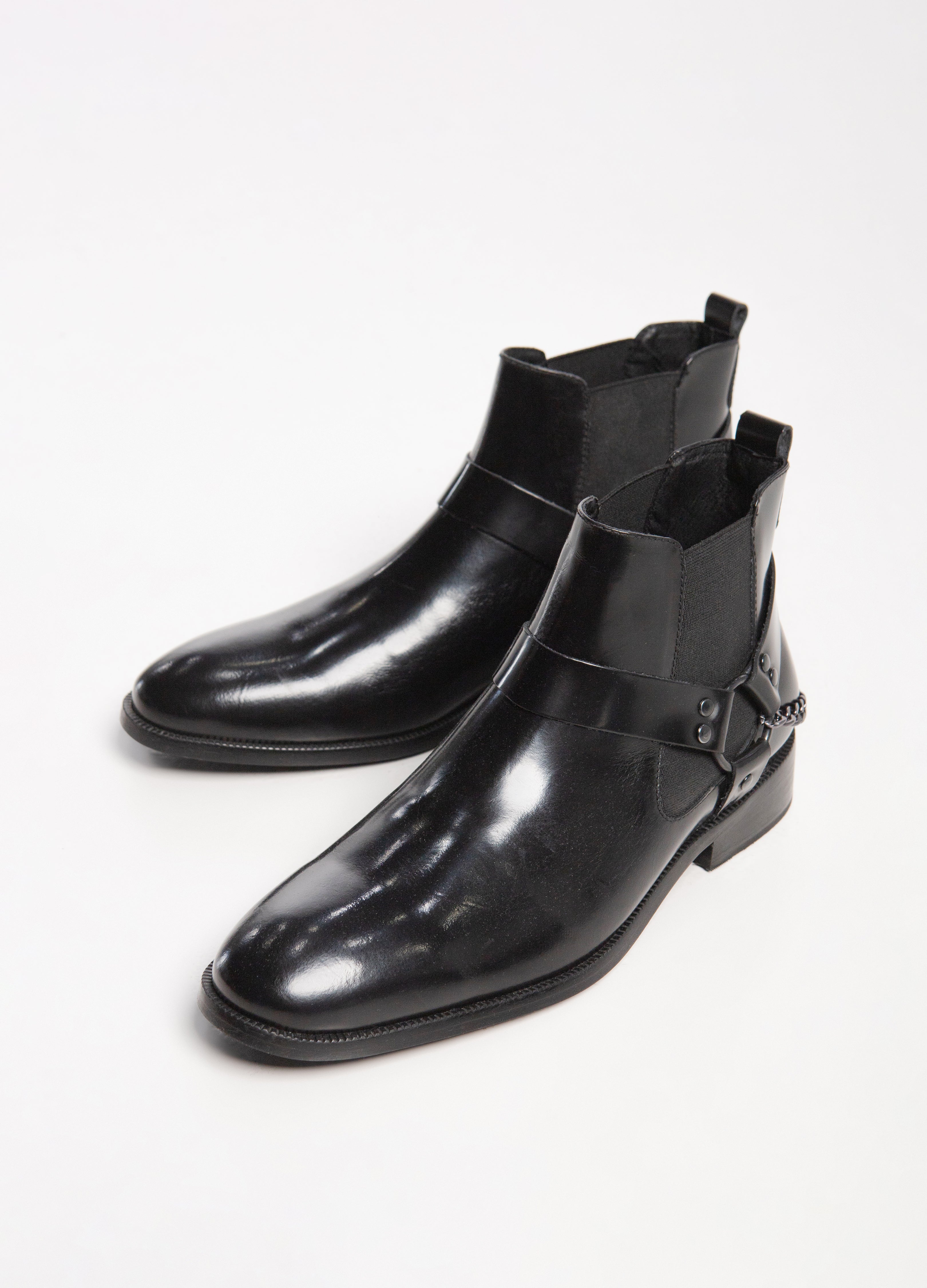Chelsea boot made of black cowhide with a shiny finish with a ring harness and rear chain.