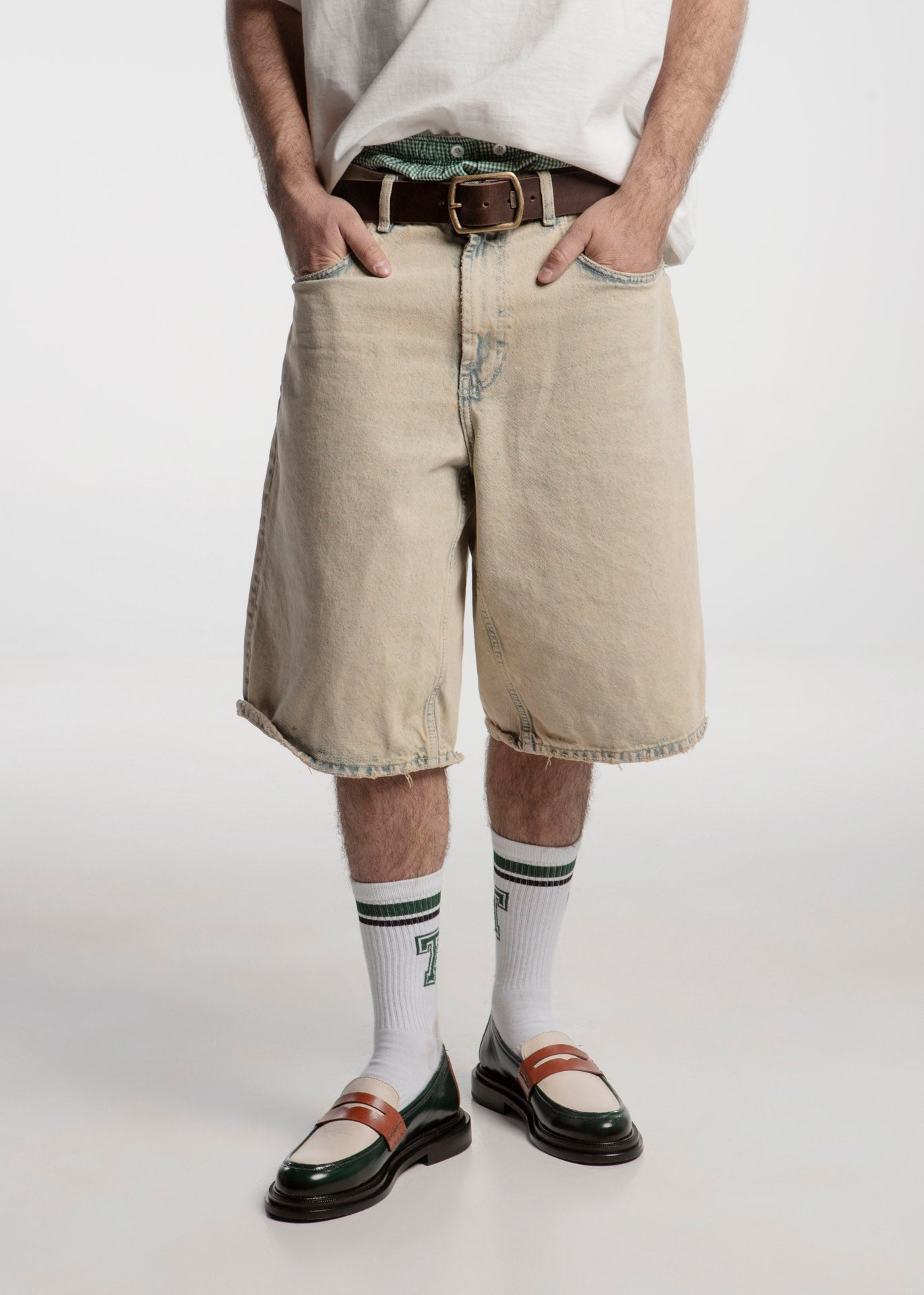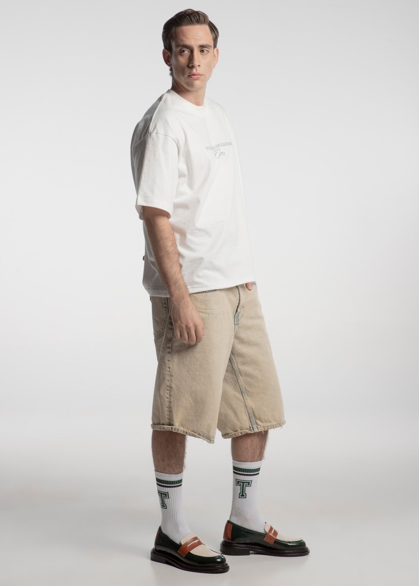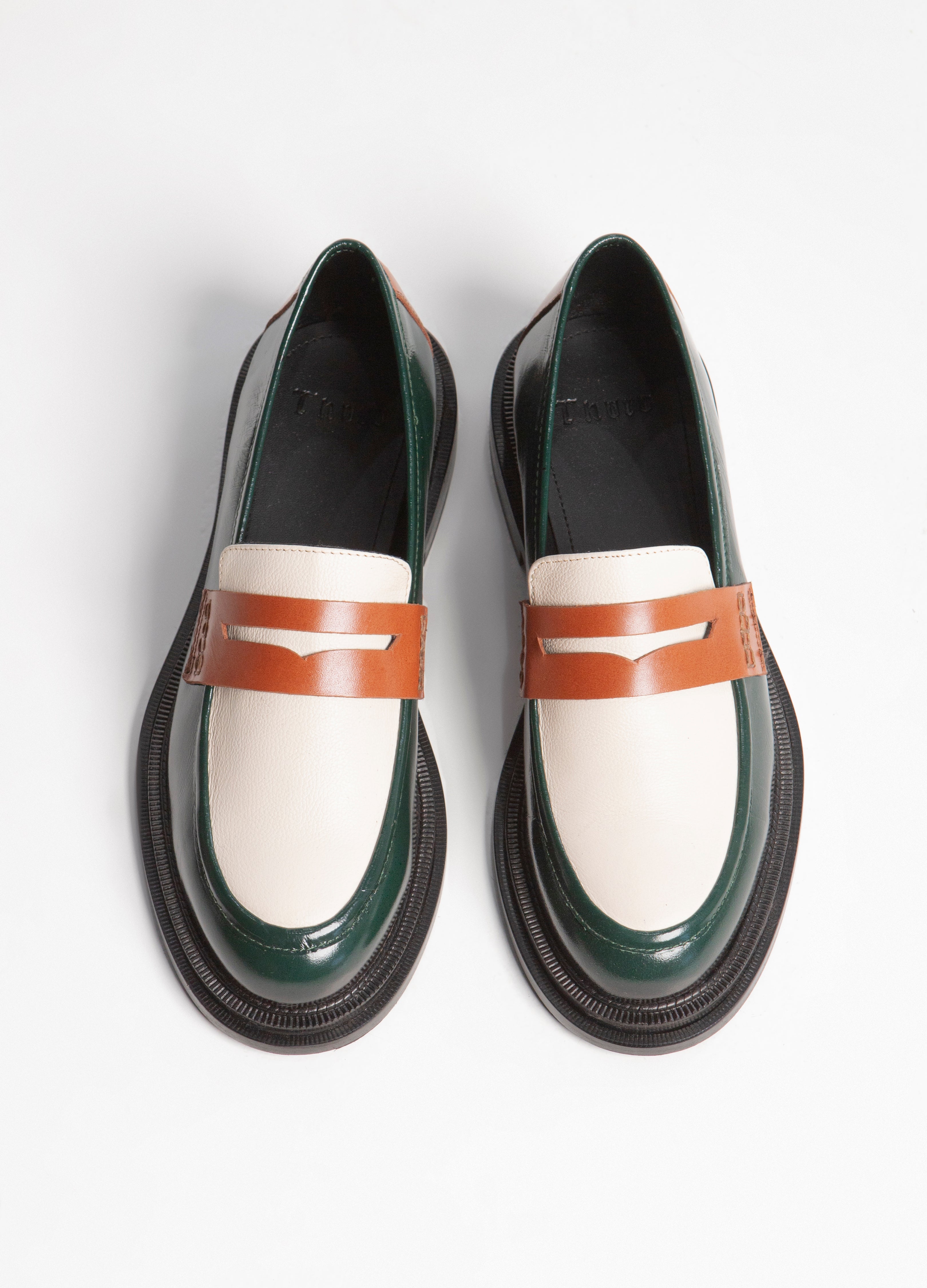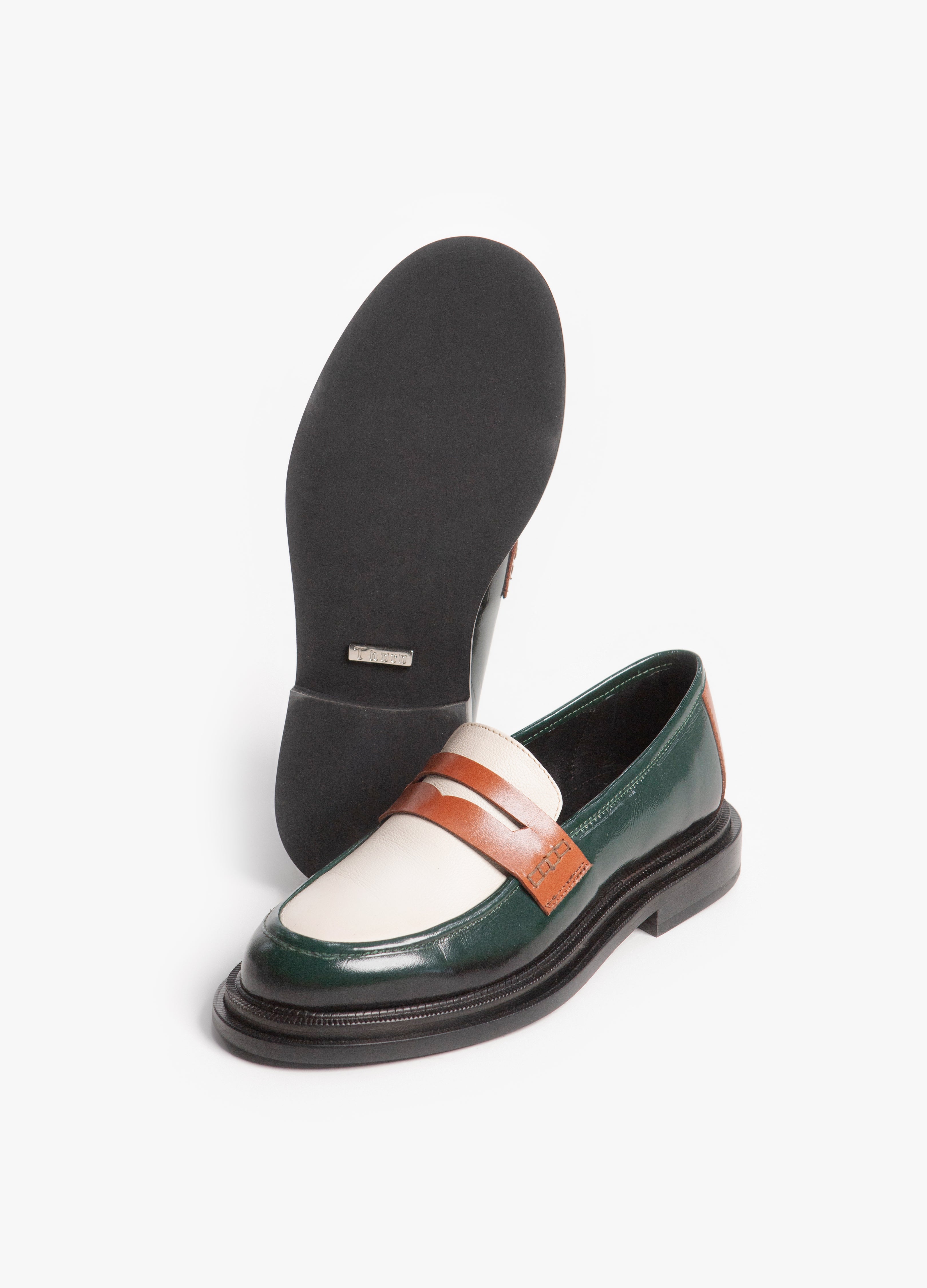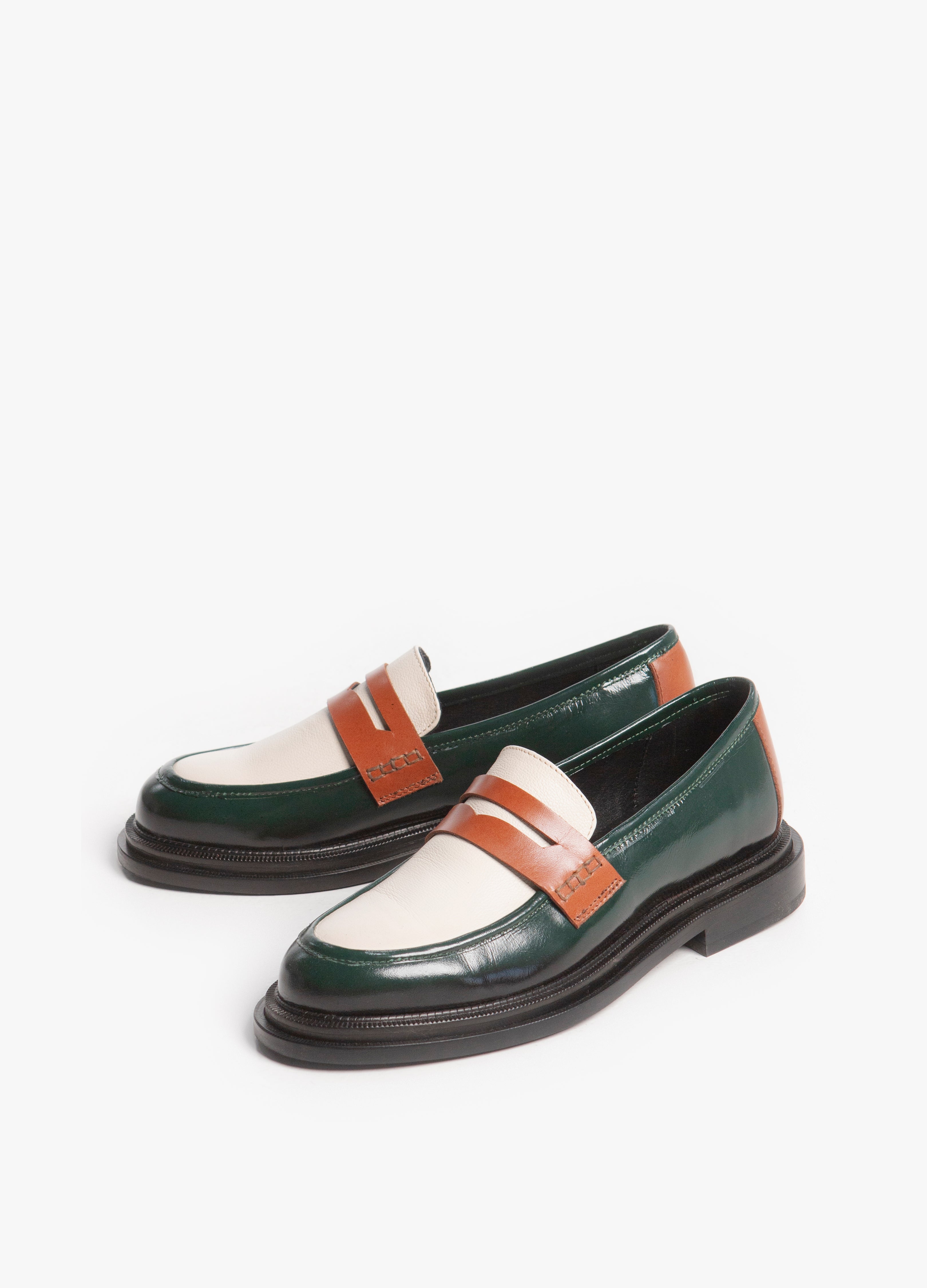 El Loafer Mirage destaca por su piel de res de alta calidad y colores vividos. Combina verde oscuro, blanco hueso, y coñac, creando un contraste llamativo. Su diseño, con correa penny, ofrece una estética elegante y distintiva.