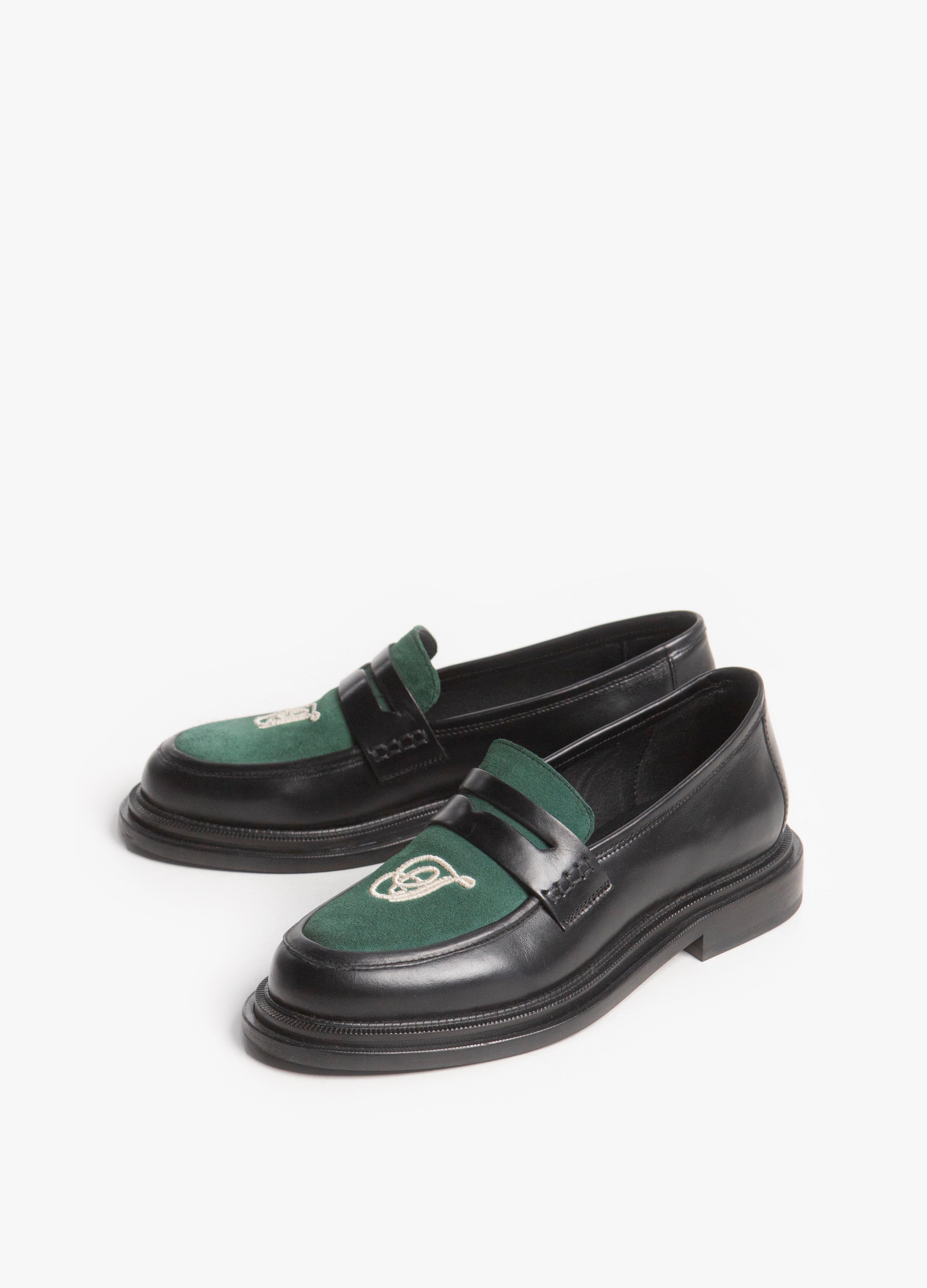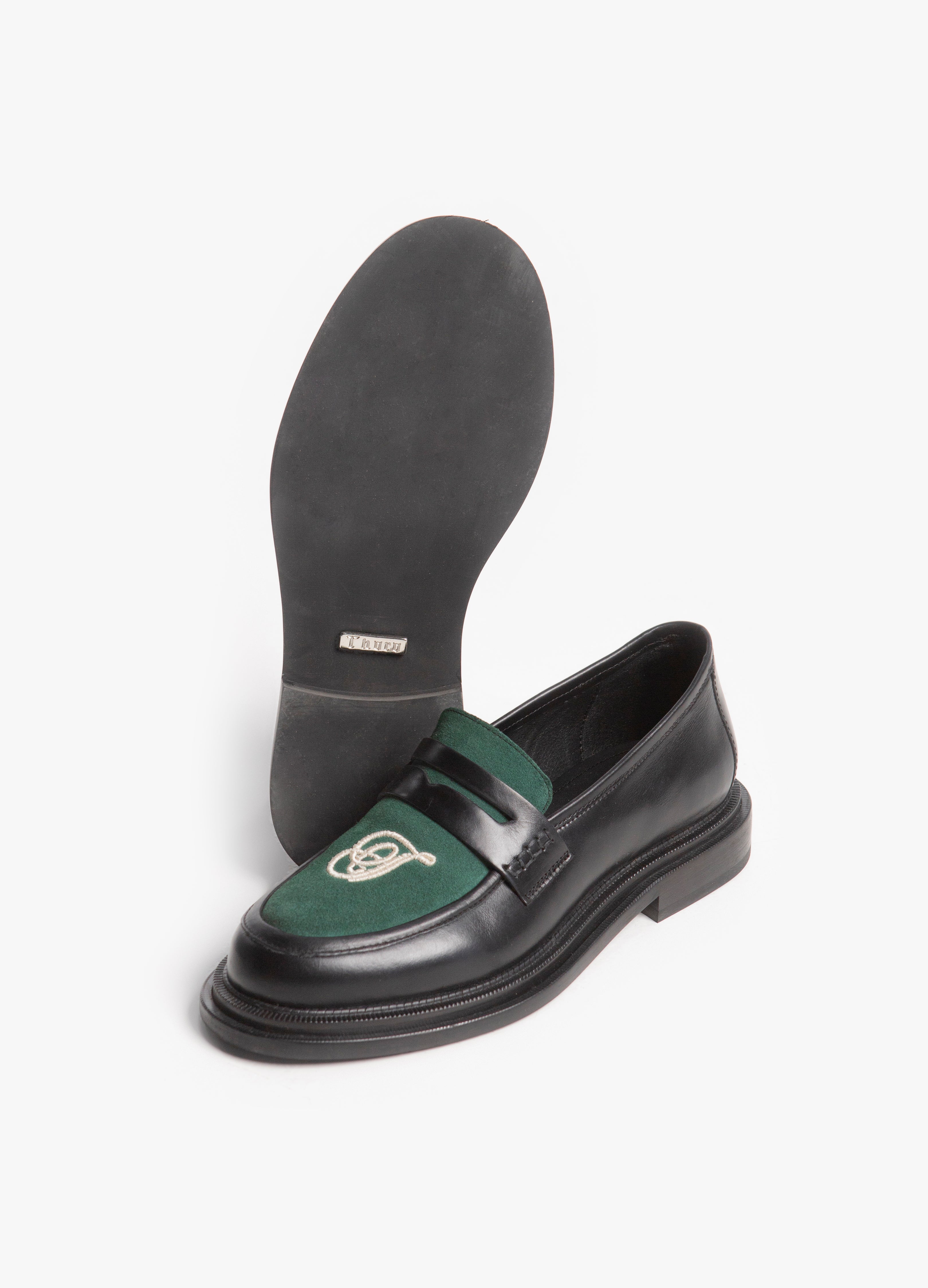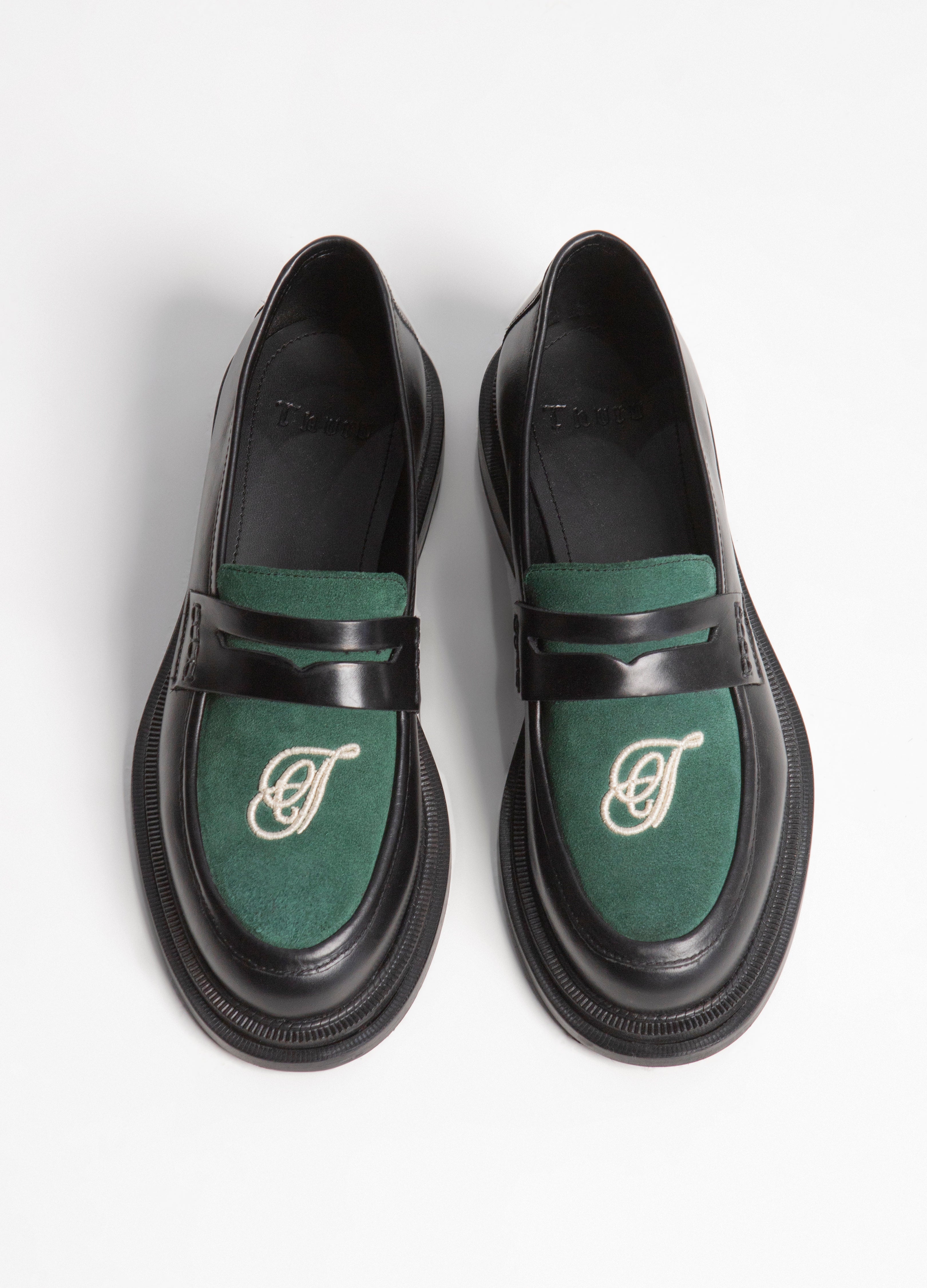 Loafer Chunky fabricado en piel de res negro con empeine en piel gamuza verde con una T bordada en blanco.