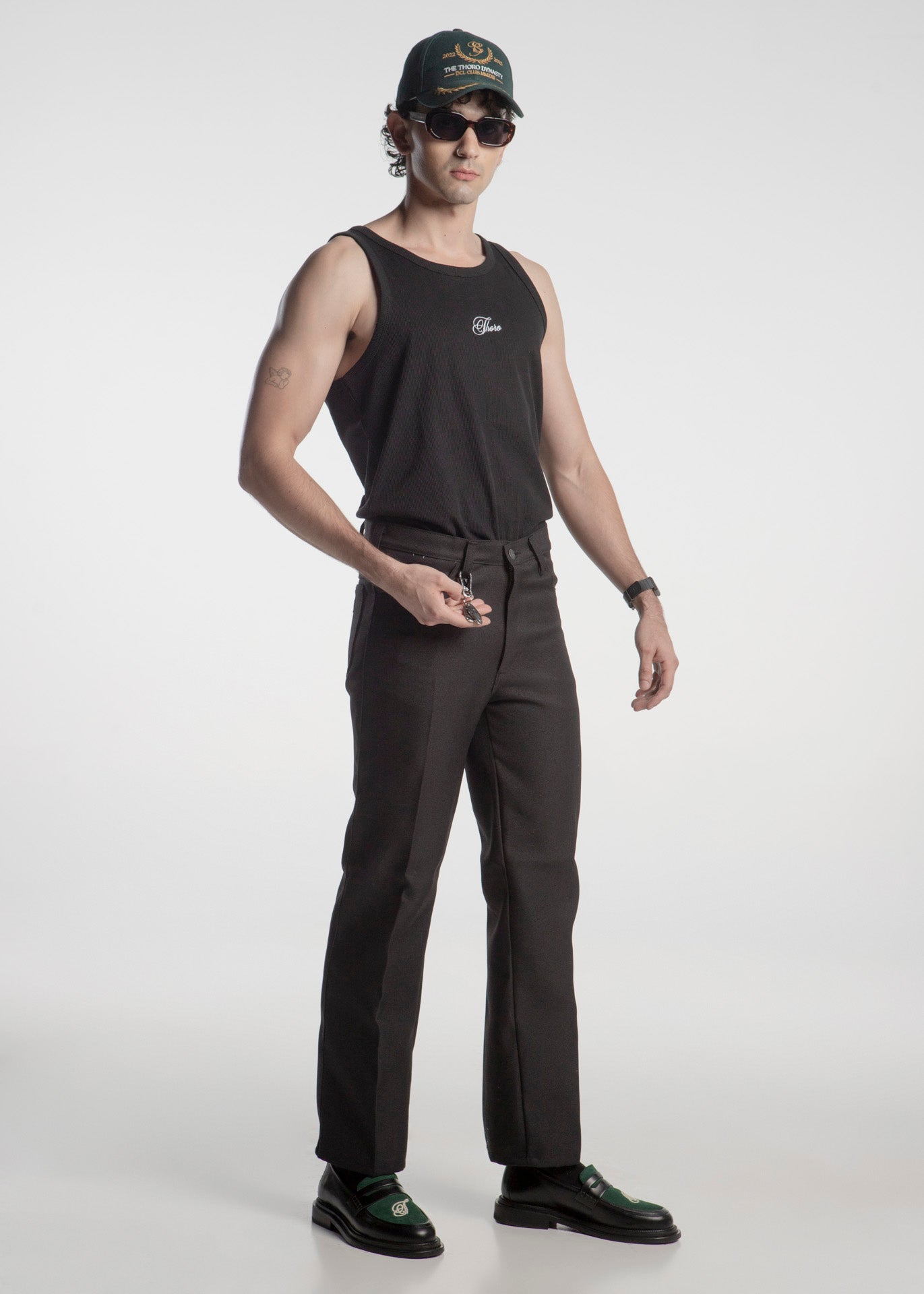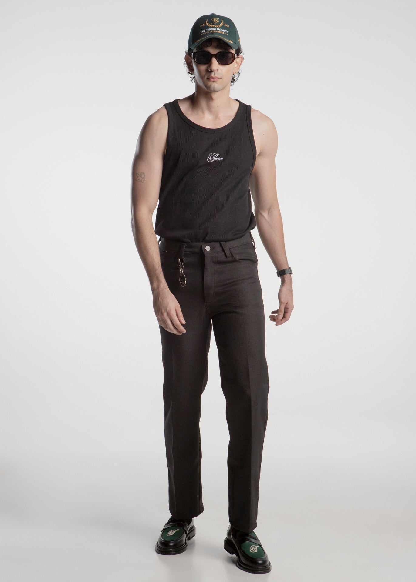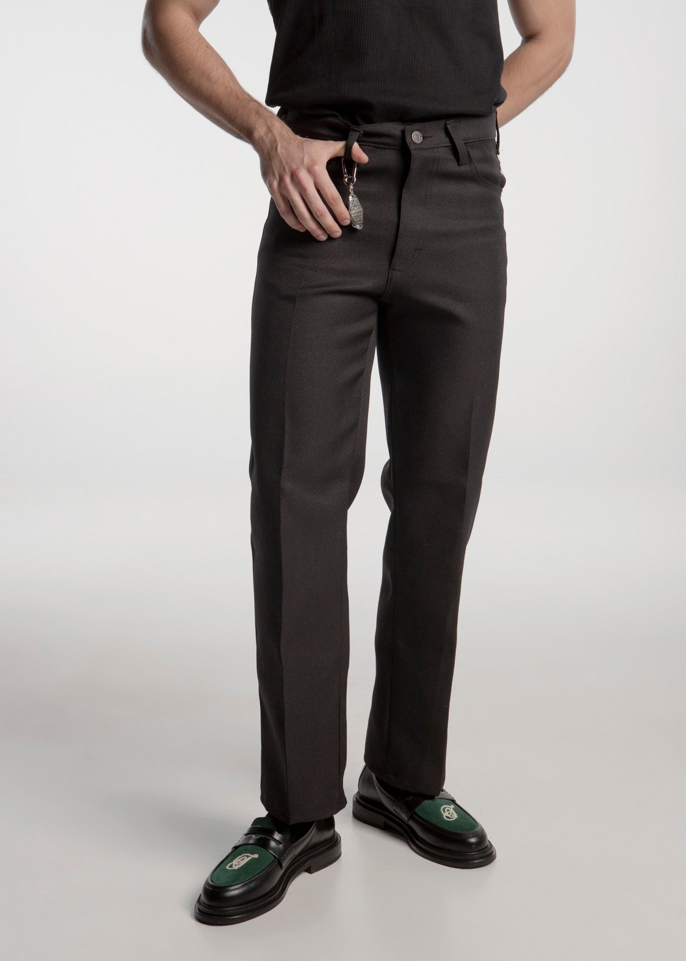 Loafer Chunky fabricado en piel de res negro con empeine en piel gamuza verde con una T bordada en blanco.