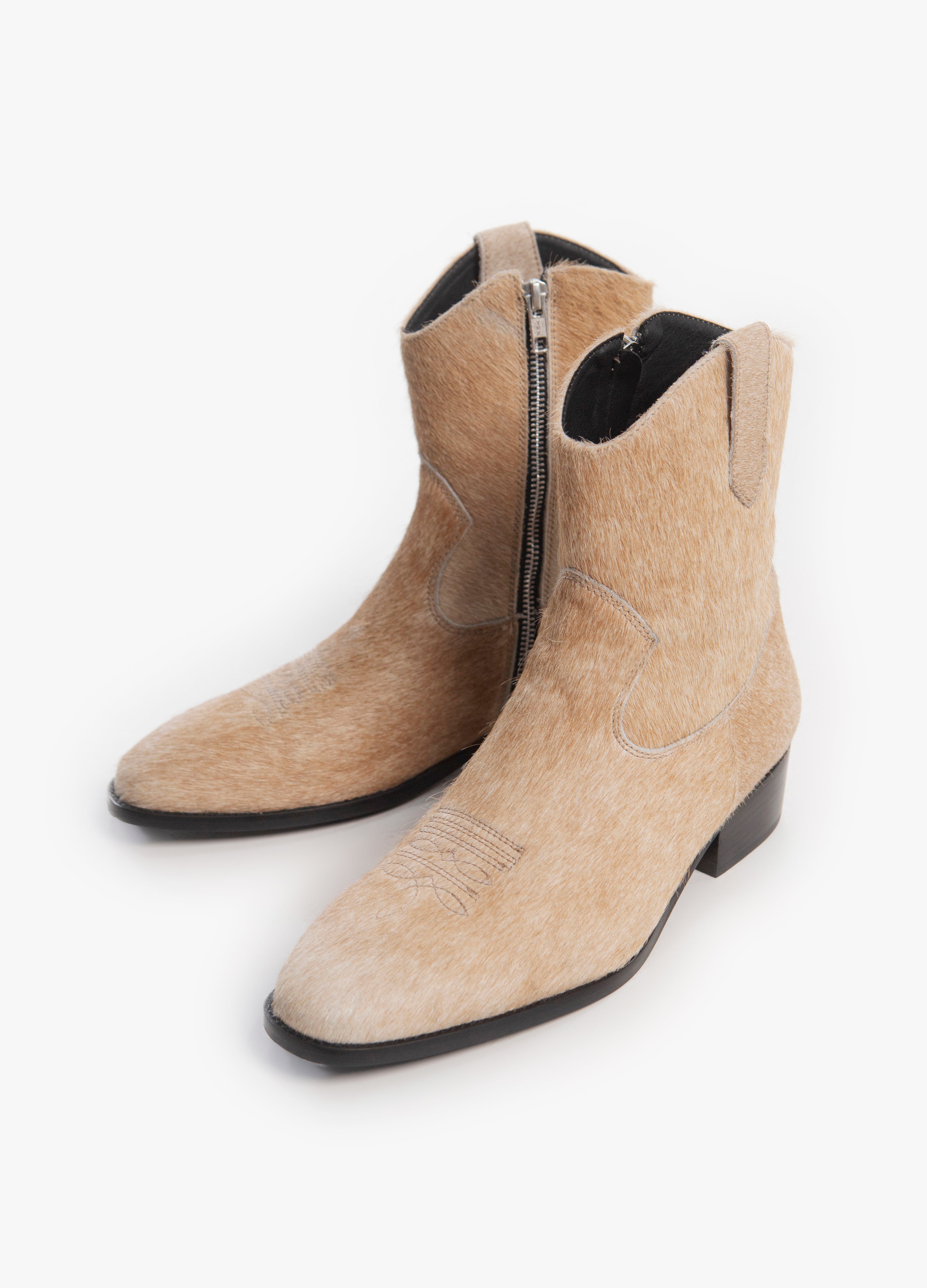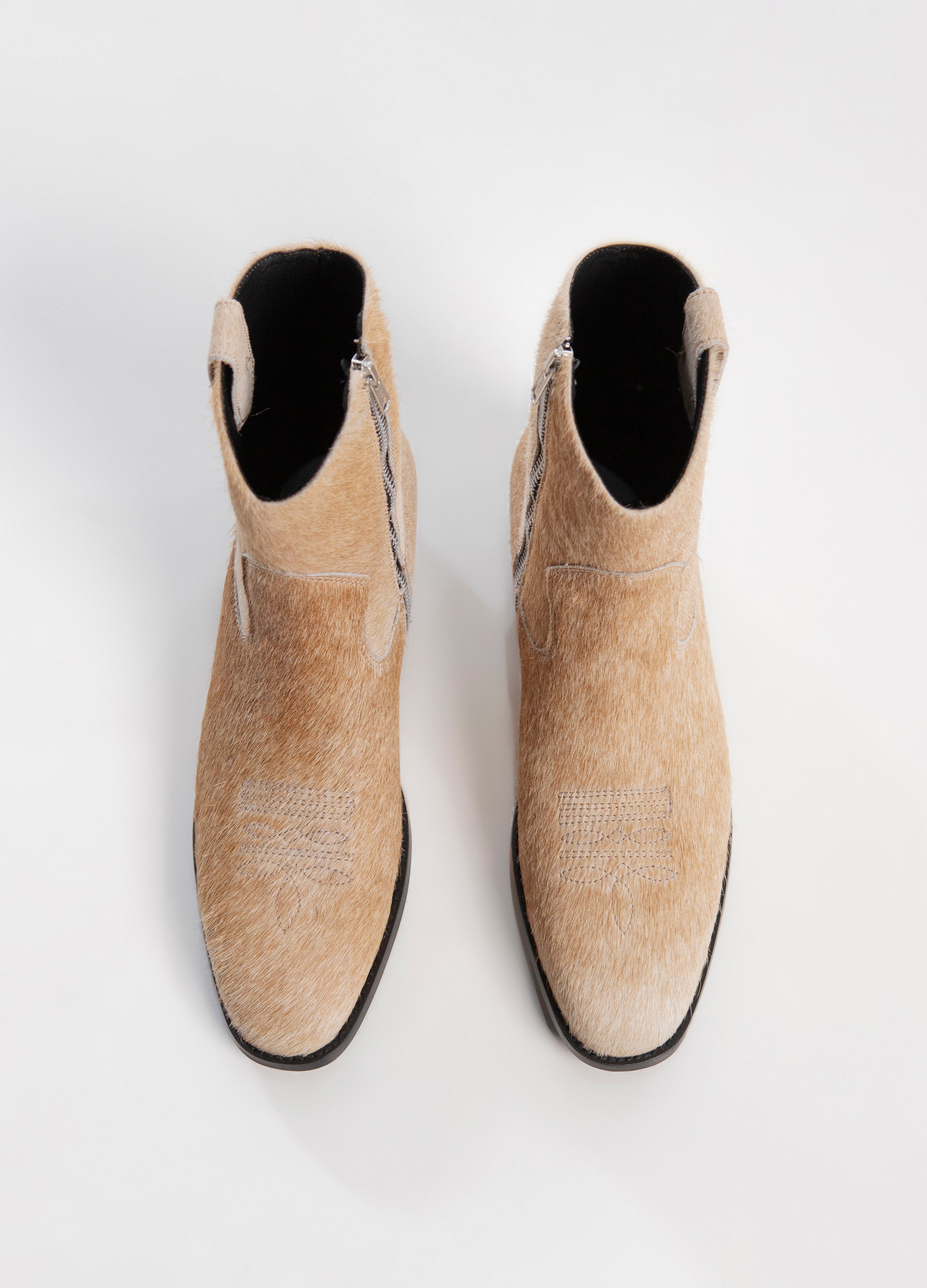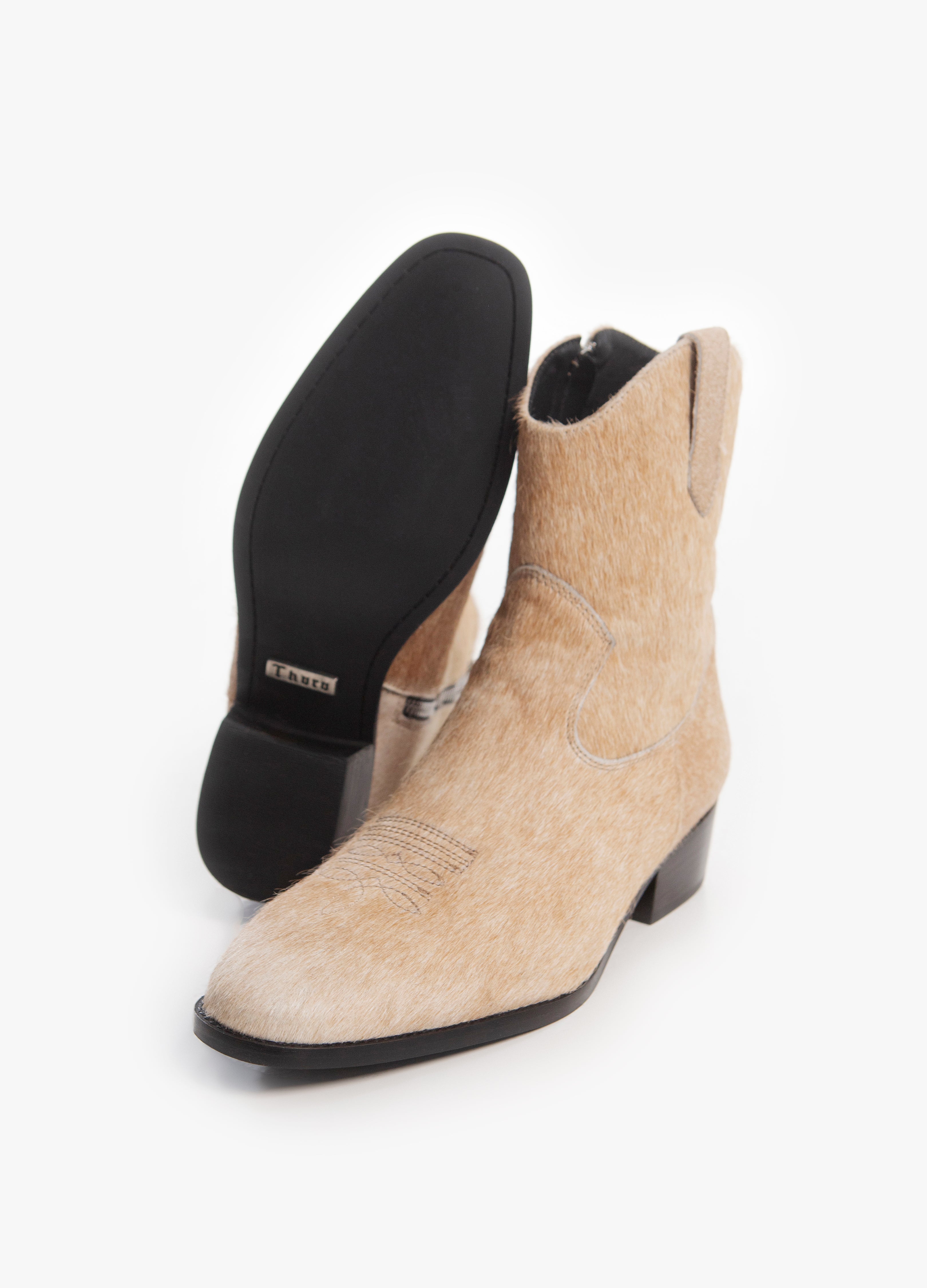 Botines tipo Chelsea de corte vaquero fabricados en piel de res con pelaje natural en color oro claro. Cuentan con cierre lateral plateado y la emblemática placa de Thoro en la suela.