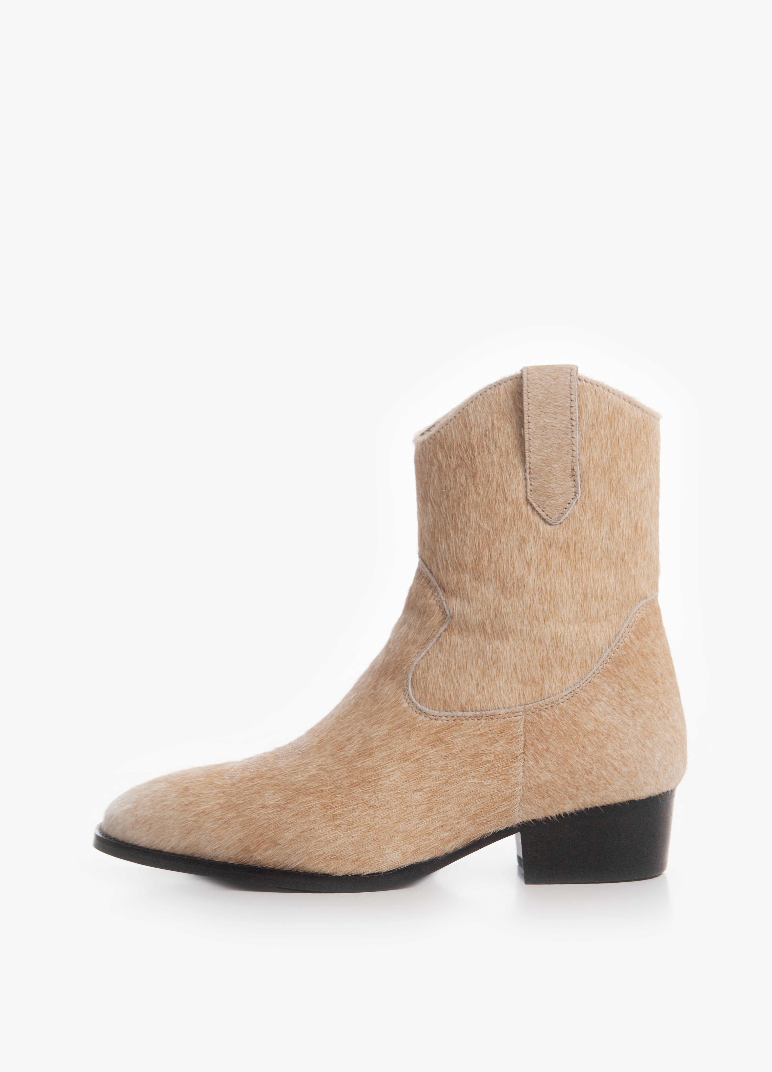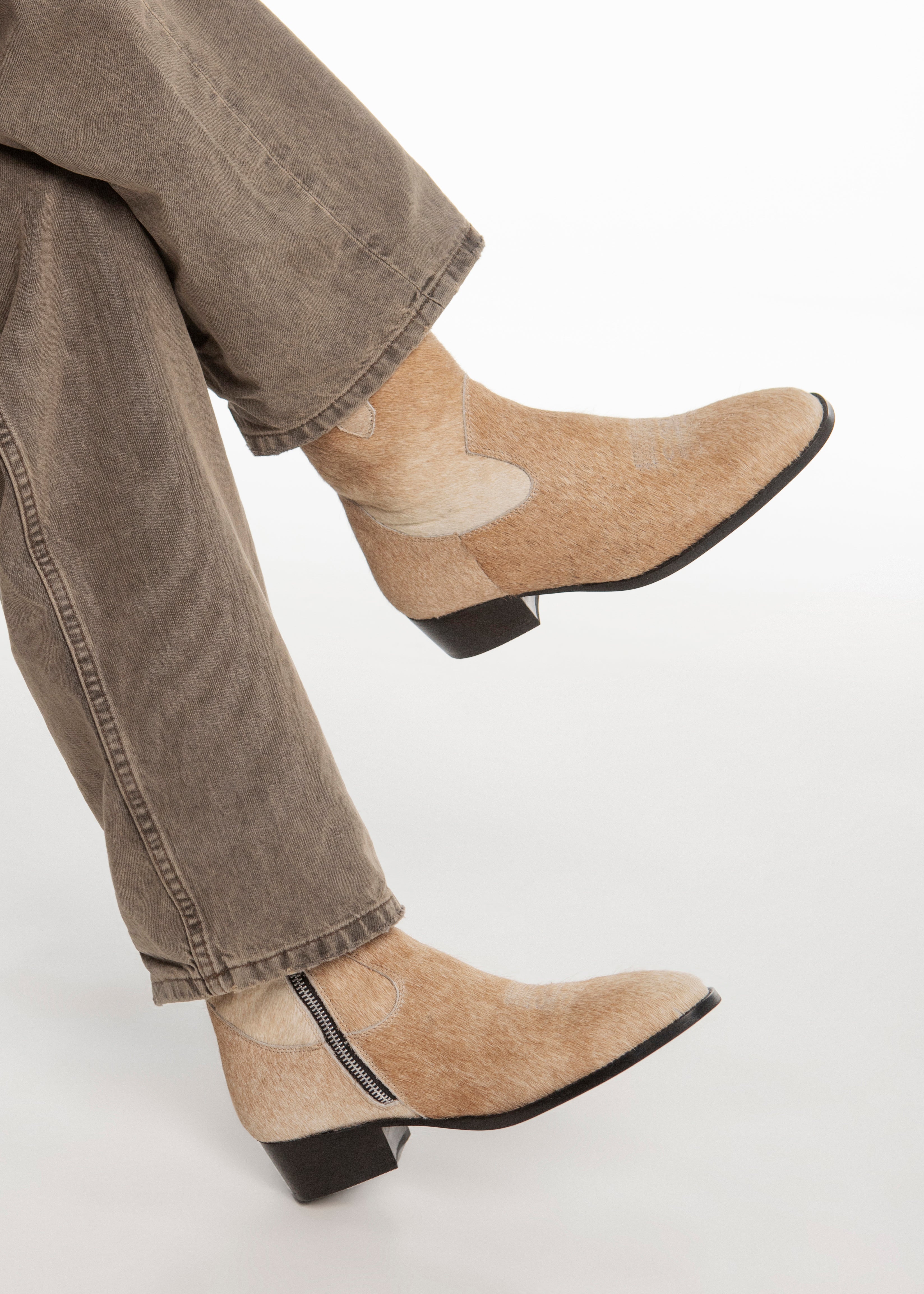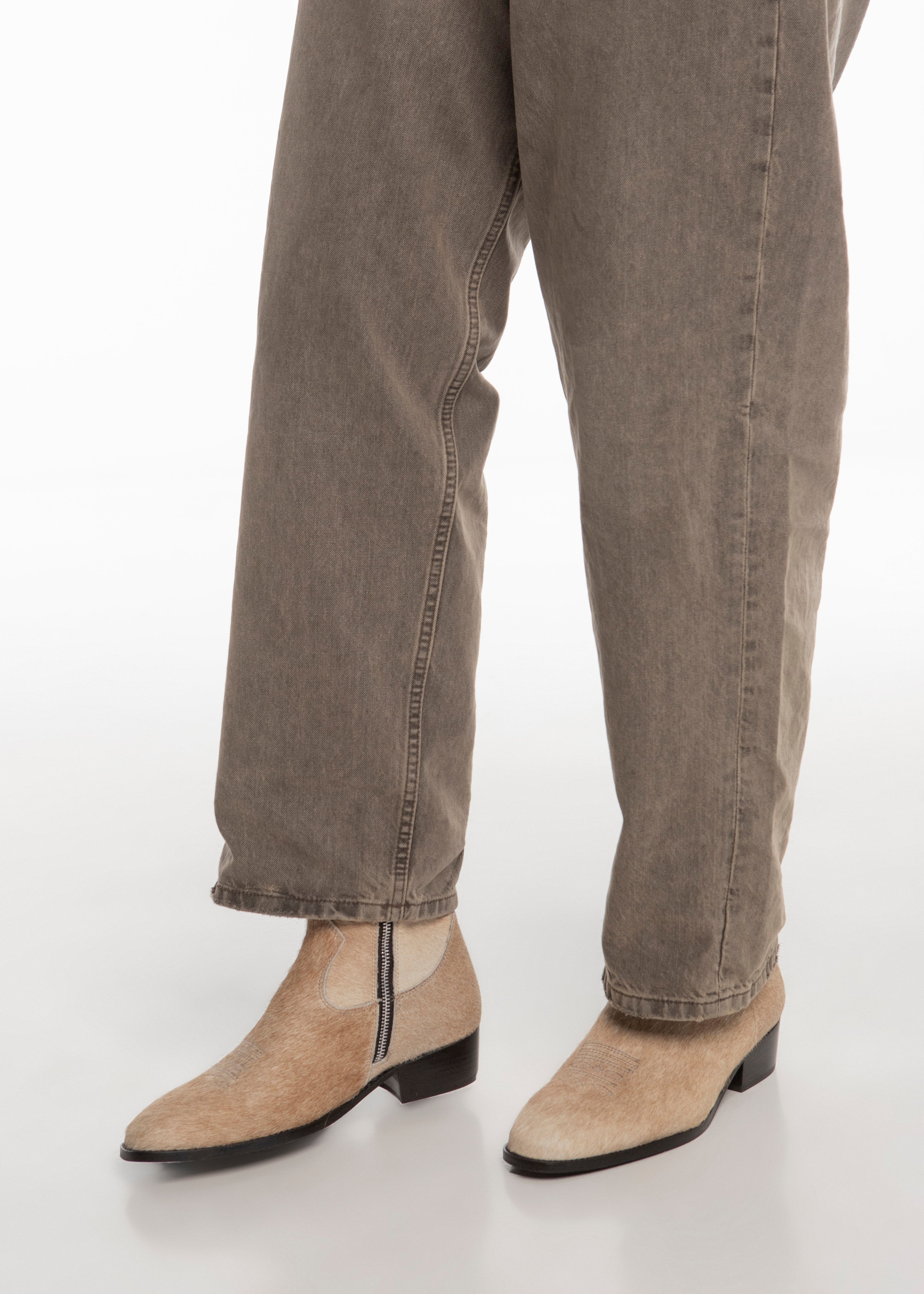 Botines tipo Chelsea de corte vaquero fabricados en piel de res con pelaje natural en color oro claro. Cuentan con cierre lateral plateado y la emblemática placa de Thoro en la suela.