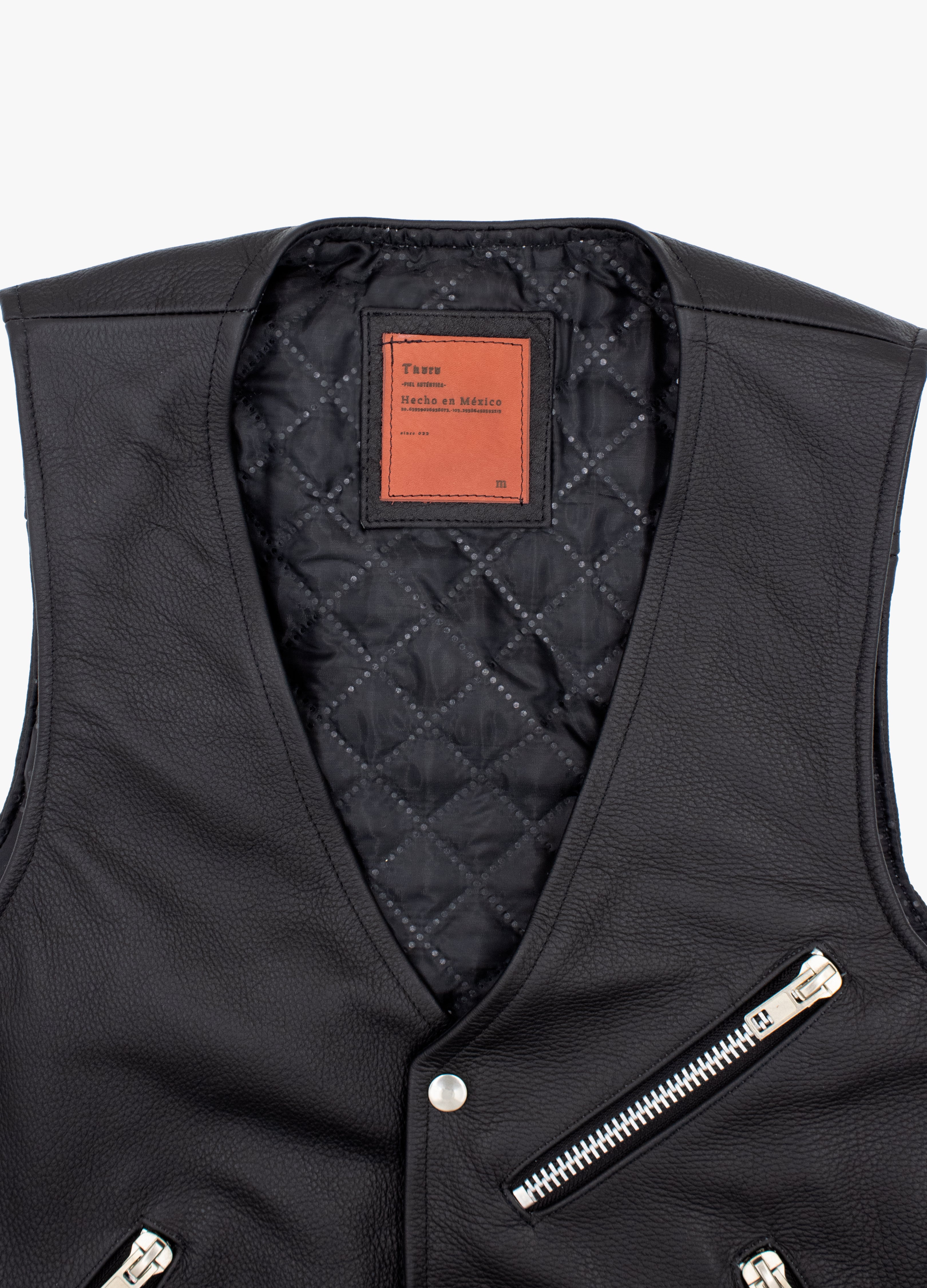 Vest made of genuine pelibuey leather, metal closures and textile lining.