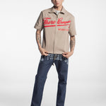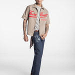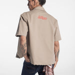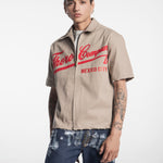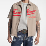 Beige boxy fit zip-up overshirt with retro "Thoro Company" script design on the front in red with a towel finish and embroidery on the back.