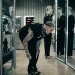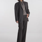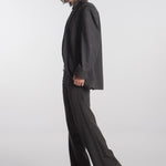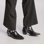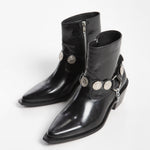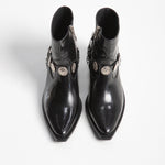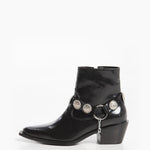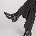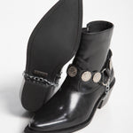 Chelsea boot made of black cowhide with a shiny finish and a harness decorated with silver medallions and chains.
