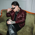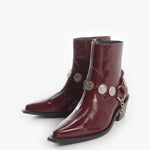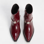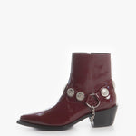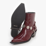 Bota (botín) estilo Chelsea fabricada en piel de res color Rojo Cherry con acabado brillante, con arnés adornado con medallones y cadenas plateadas y cierre lateral color plata para facilitar su uso