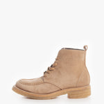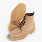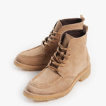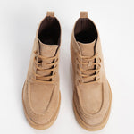 El botín Dusty es un diseño chukka que captura la esencia del terreno árido y la comodidad. Está confeccionado en piel gamuza de un tono beige arena, lo que le da un look monocromático y de gran textura. Su diseño presenta la clásica costura moc toe (punta de mocasín) y se asienta sobre una suela de crepe gruesa y flexible, que ofrece una comodidad excepcional. Este calzado es ideal para quienes buscan una pieza casual, versátil y con un toque natural.