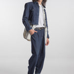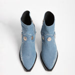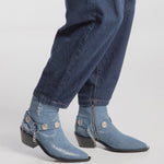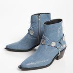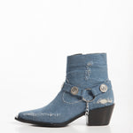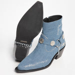 Chelsea boot made of denim with a harness decorated with medallions and silver chains.