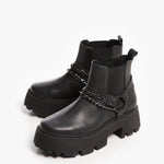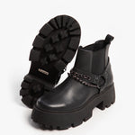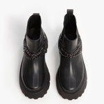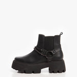 Chelsea boots made of black cowhide with a thick sole, elastic sides and a harness decorated with chains.