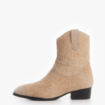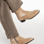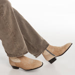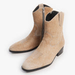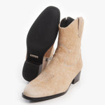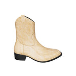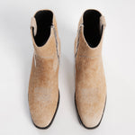 Botines tipo Chelsea de corte vaquero fabricados en piel de res con pelaje natural en color oro claro. Cuentan con cierre lateral plateado y la emblemática placa de Thoro en la suela.