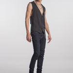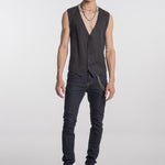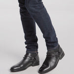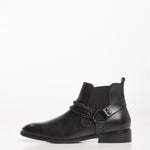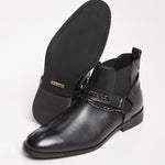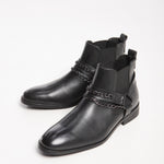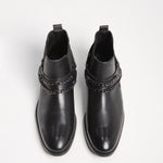 Chelsea boot made of black cowhide with harness, ring and decorative chains on the instep.