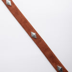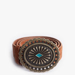 • Hebilla: Ovalado de aleación metálica envejecida, con grabado radial y calado decorativo. Al centro, una incrustación de resina turquesa en forma de rombo, evocando el estilo navajo tradicional.