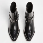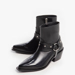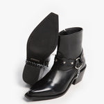 Chelsea boot made of black cowhide with a shiny finish with a harness decorated with star rivets and silver chains.