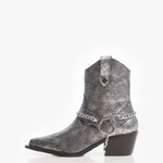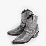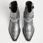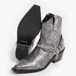 Chelsea boot made of silver-colored cowhide with harness, rings and chains, cowboy boot design and the emblematic Thoro plaque on the sole.