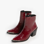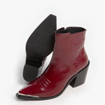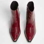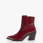 Chelsea boot made of red patent cowhide leather with Cuban heel, embroidered reliefs on the instep, metal side closure and metal toe.