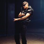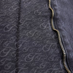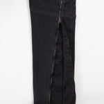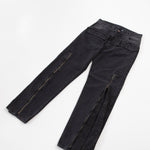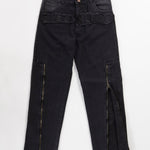 Pants made of 100% black denim with zippers at the bottom to make them straighter pants when closed or more flared when opened, they have a laser-engraved T-letter pattern and front design is embroidered on a worn cut, captions "Bestial Club" in Gothic letters.