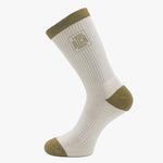 Calceta fabricada en algodón premium, en color beige con detalles en color dorado, bordado de Thoro x Rich vagos en color dorado.