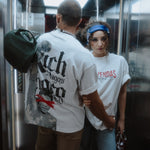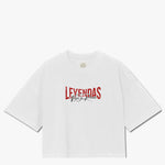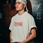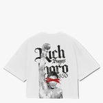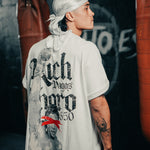 Playera blanca fabricada en 100% algodón con el diseño de Leyendas en parte frontal y estampado trasera de Rich vagos x Thoro 650 con ilustración de un boxeador con el puno en alto.