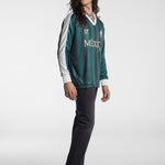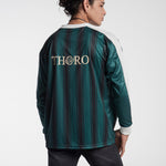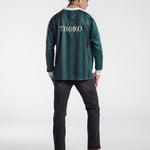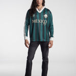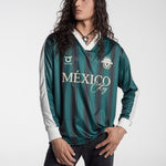 Long-sleeved jersey with stripes in green tones and white lines on the sleeves with a "Mexico City" print on the front and "Thoro" on the back in gold.