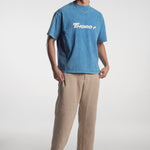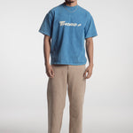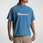Playera azul acabado acid washed de corte boxy fabricada en 100% algodón con la marca de Thoro acompañada de un caballo en el pecho y en la espalda la t junto al caballo con el subtítulo "Your Lucky Number is 650" impresa en serigrafía color blanco.
