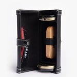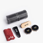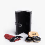 Pack made of black leather. Includes neutral color grease, black color grease, wooden applicator brush, polishing cloth and a shoehorn.