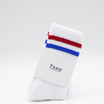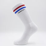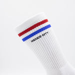 Sock made of premium cotton in white with red and blue lines and "Mexico City" embroidery.