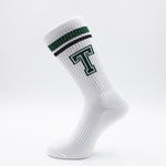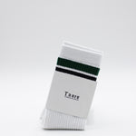 Sock made of premium cotton in white with black and green lines and a green college-style T.
