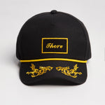 Gorra ajustable fabricada en loneta color negro con bordados en color dorado en parte frontal y visera.