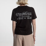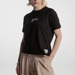 Playera tipo Rangla negra fabricada en algodón con corte slim con diseño en serigrafía con pecho color blanco.