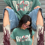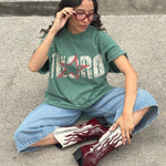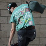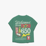 La camiseta Welcome Home es una prenda confeccionada en un tejido color verde con un efecto desgastado, el frente lleva el logo THORO y una estrella central. El reverso destaca con un gran print de estilo letrero de neón que dice "WELCOME HOME" y el número "650".