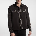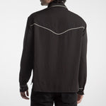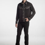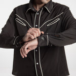 Camiseta fabricada en tela tipo seda color Negro con ribetes vaqueros en color blanco, botones a presión estilo perla.