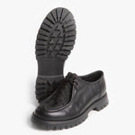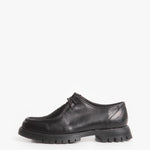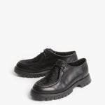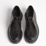 Zapato estilo wallabee, fabricado en piel de res color negro, con suela gruesa de goma y empeine con pelaje natural.