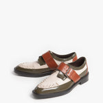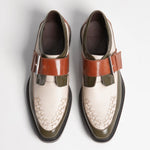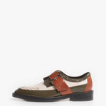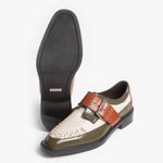 El Gatsby Mirage es un zapato que deslumbra con su diseño multicolor y sus múltiples texturas. Confeccionado en varias pieles, combina tonos blanco crema, verde olivo y un marrón cognac en la correa con hebilla, creando un efecto visual complejo. Los detalles trenzados en la puntera y el brogue lateral le dan una riqueza adicional. Este zapato es ideal para quien busca llevar un estilo atrevido, lleno de contraste y que combine la elegancia clásica con un aire moderno y desenfadado.