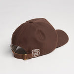 Gorra fabricada en loneta de alta calidad en color marrón con bordado frontal en color hueso, corra de piel ajustable y parches laterales decorativos.