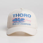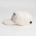 Gorra ajustable de loneta en color hueso con diseño bordado en azul y rosa.
